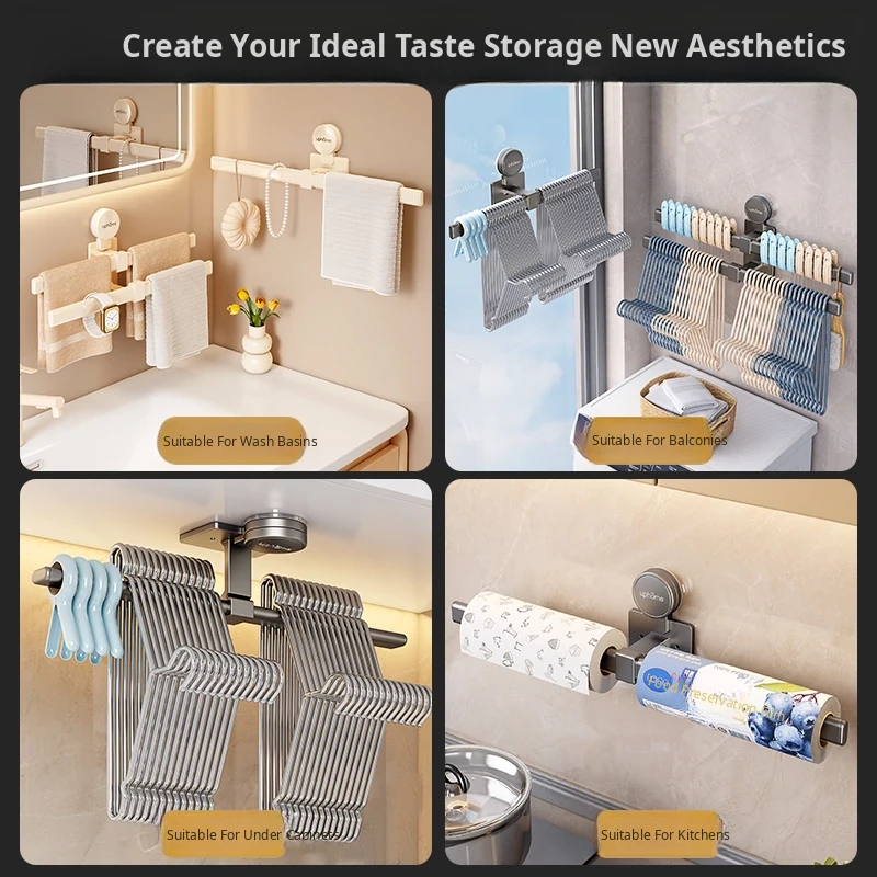 Cream white/suction cup space aluminum single rod towel storage rack 15.75in long【Rust-resistant and durable/multi-use scenarios】