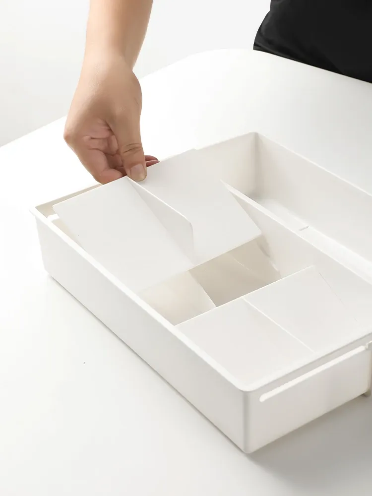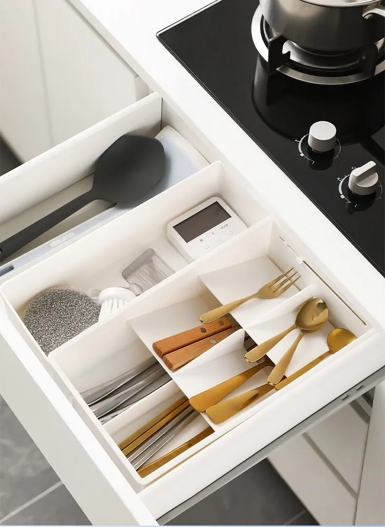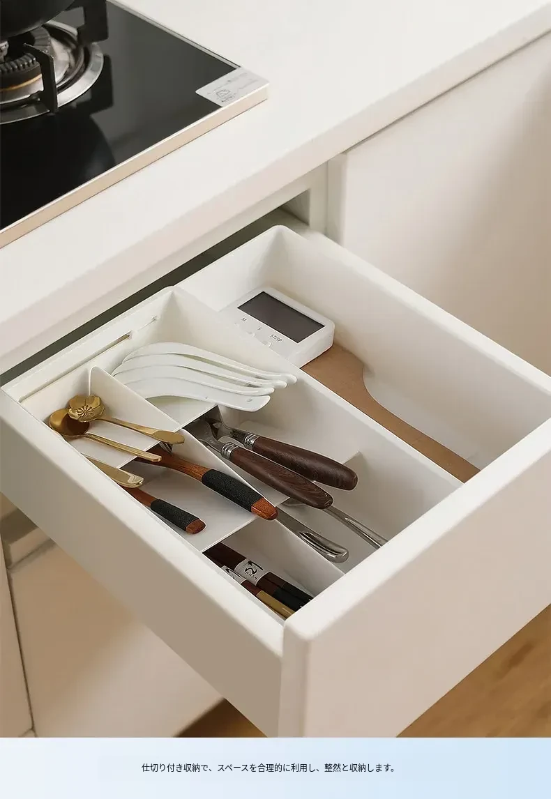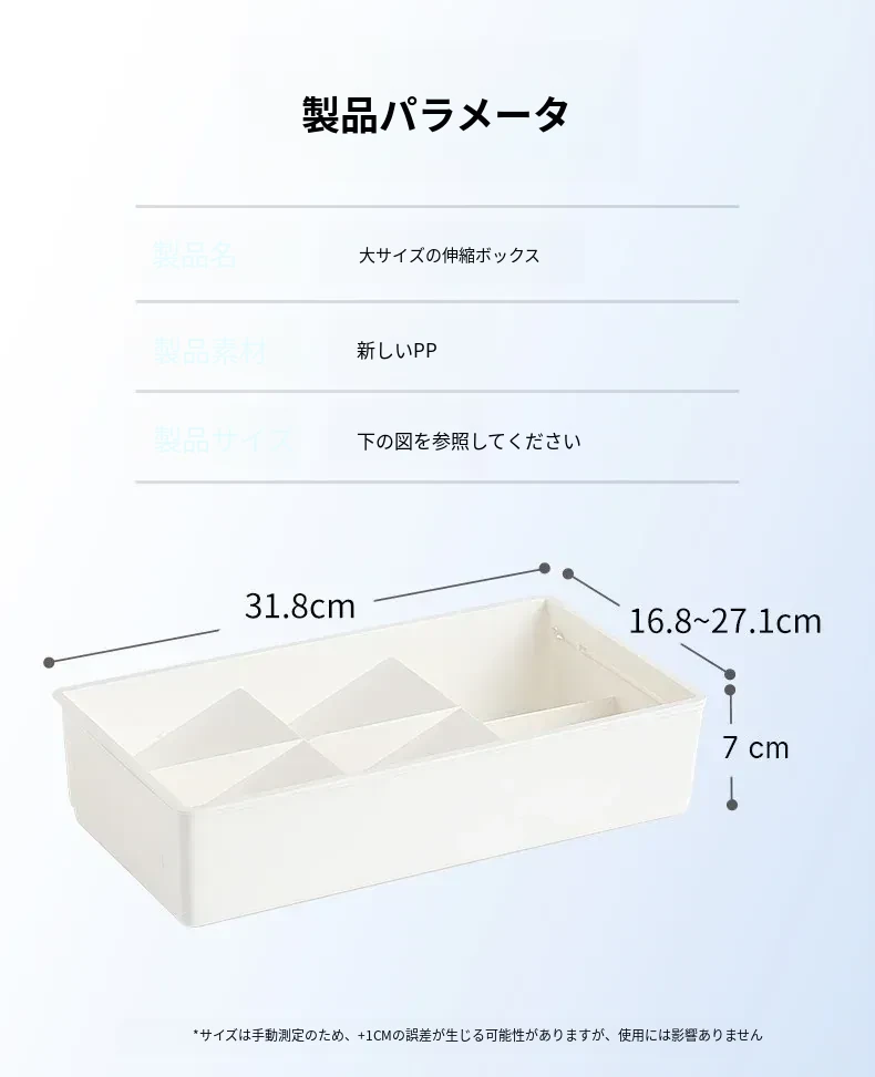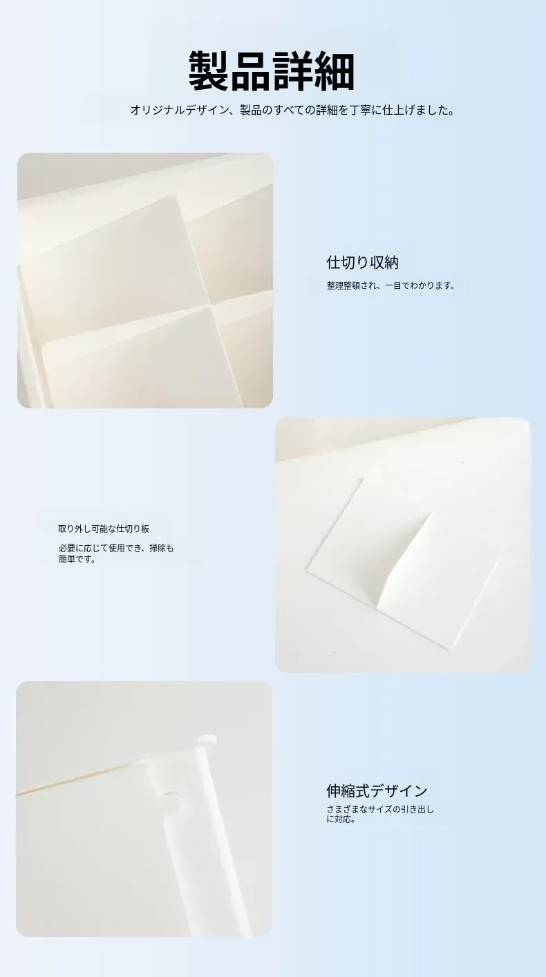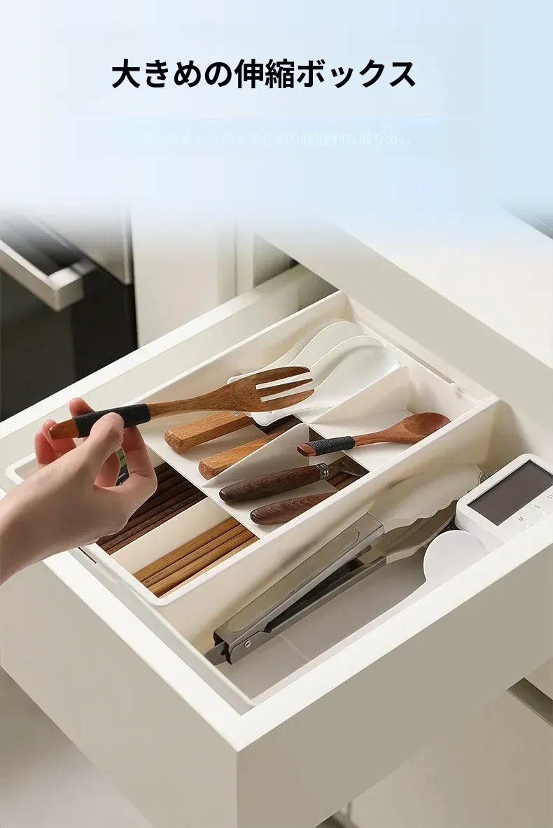 伸縮式引き出し収納ボックス - 化粧品や小物を整理整頓!内蔵仕切りでキッチンやオフィスの引き出しもスッキリ!使いやすさとスタイリッシュさを兼ね備えた収納アイテムです。