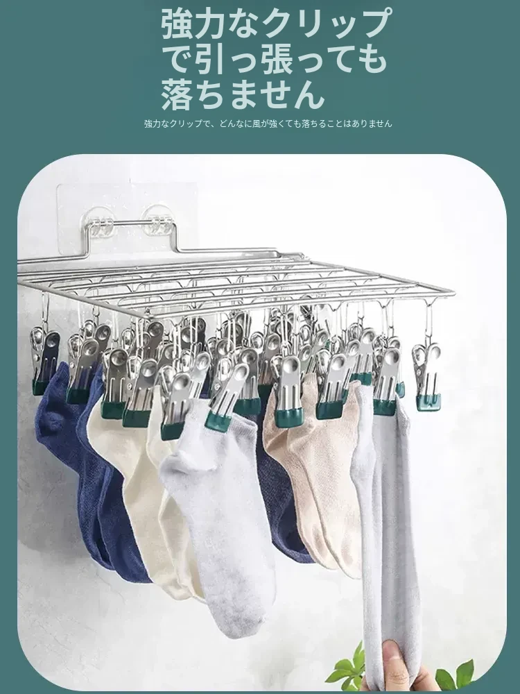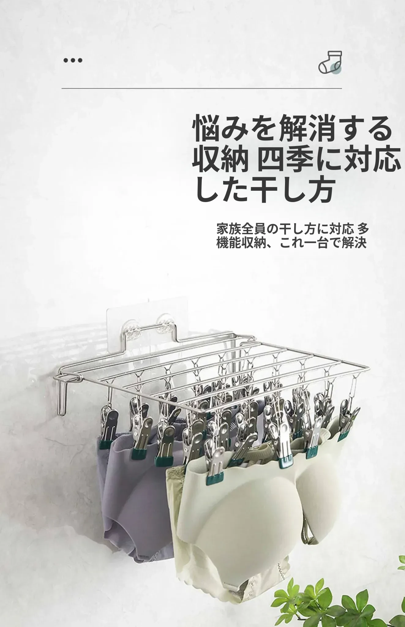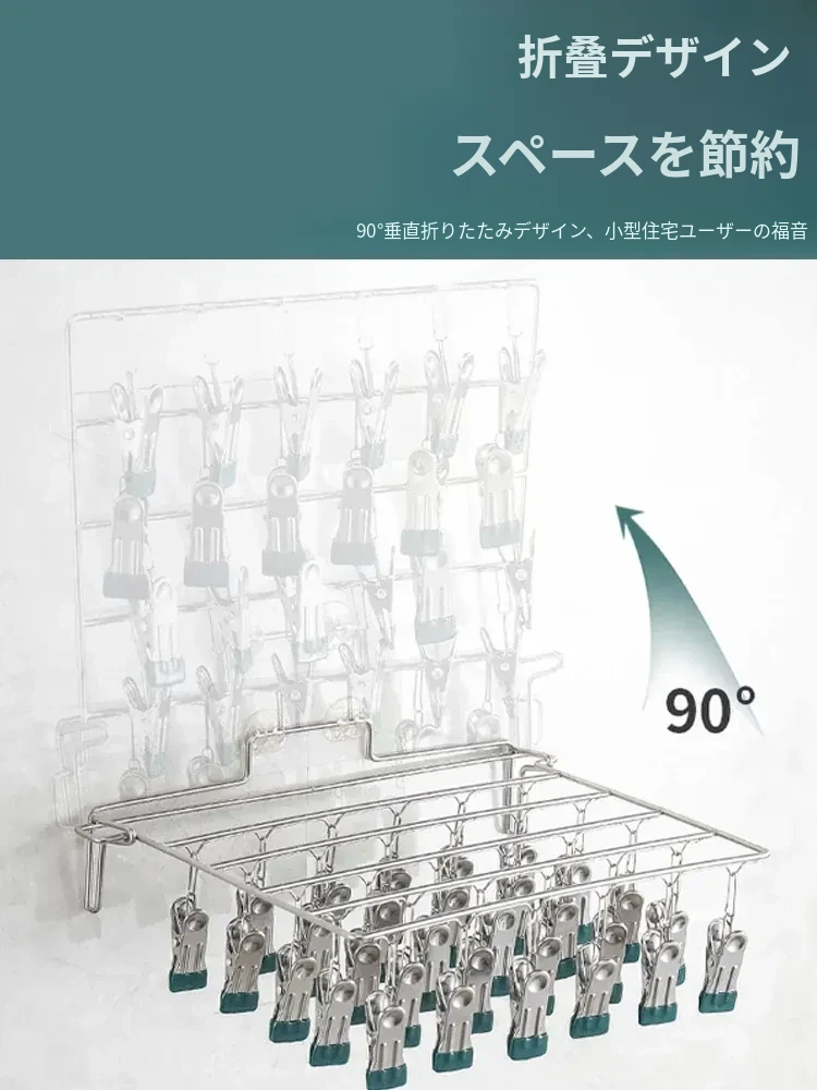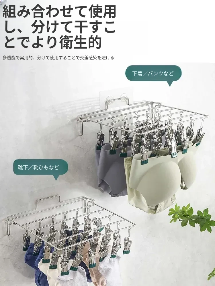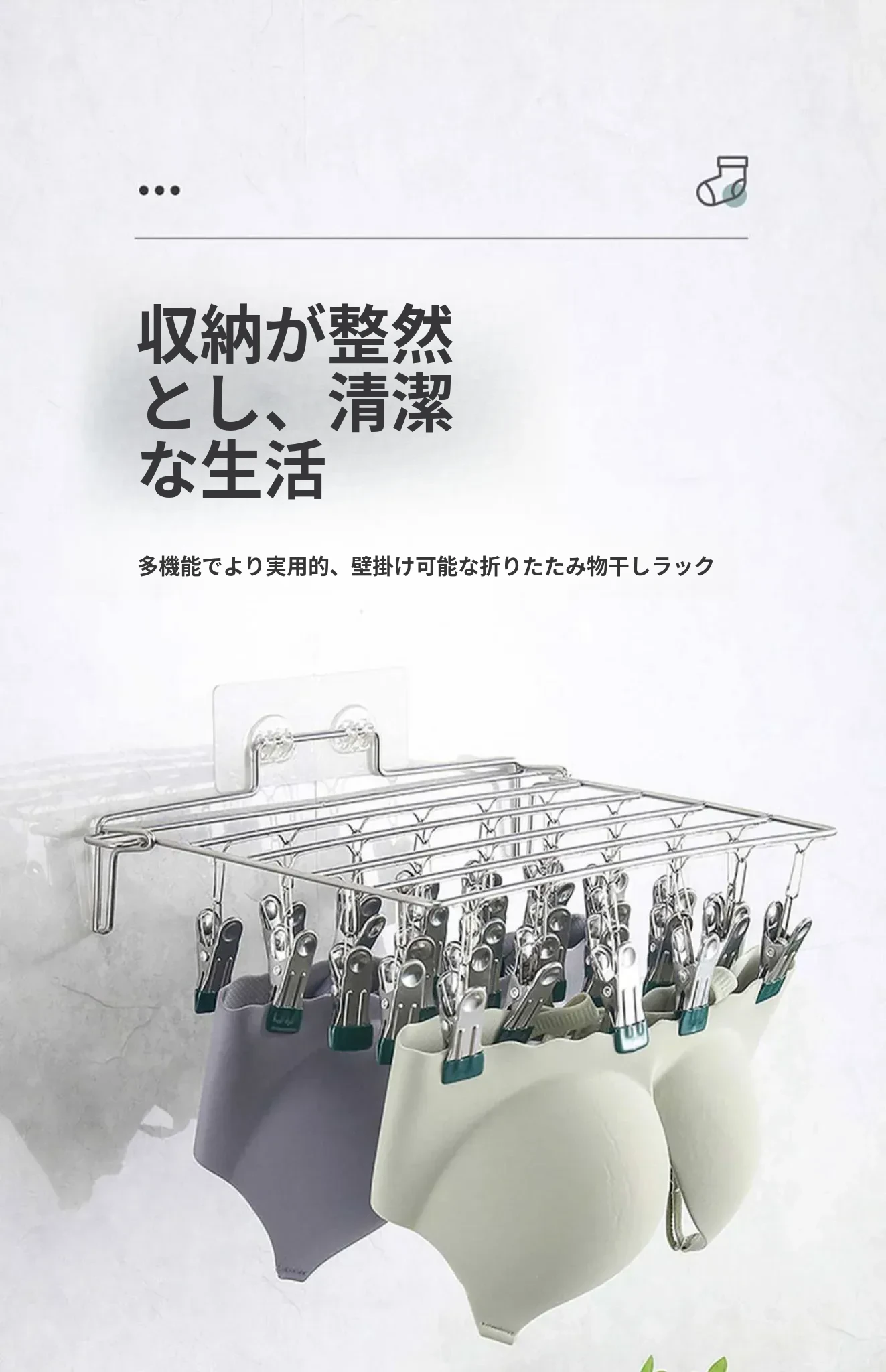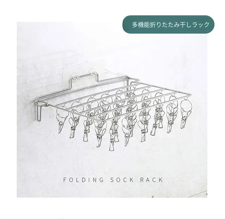 折りたたみ式衣類干しラック - 多機能クリップ付き!壁掛けで便利な靴下干しの必需品!家用バルコニーでの風対策もバッチリ。下着や赤ちゃんの靴下も安心して干せます!