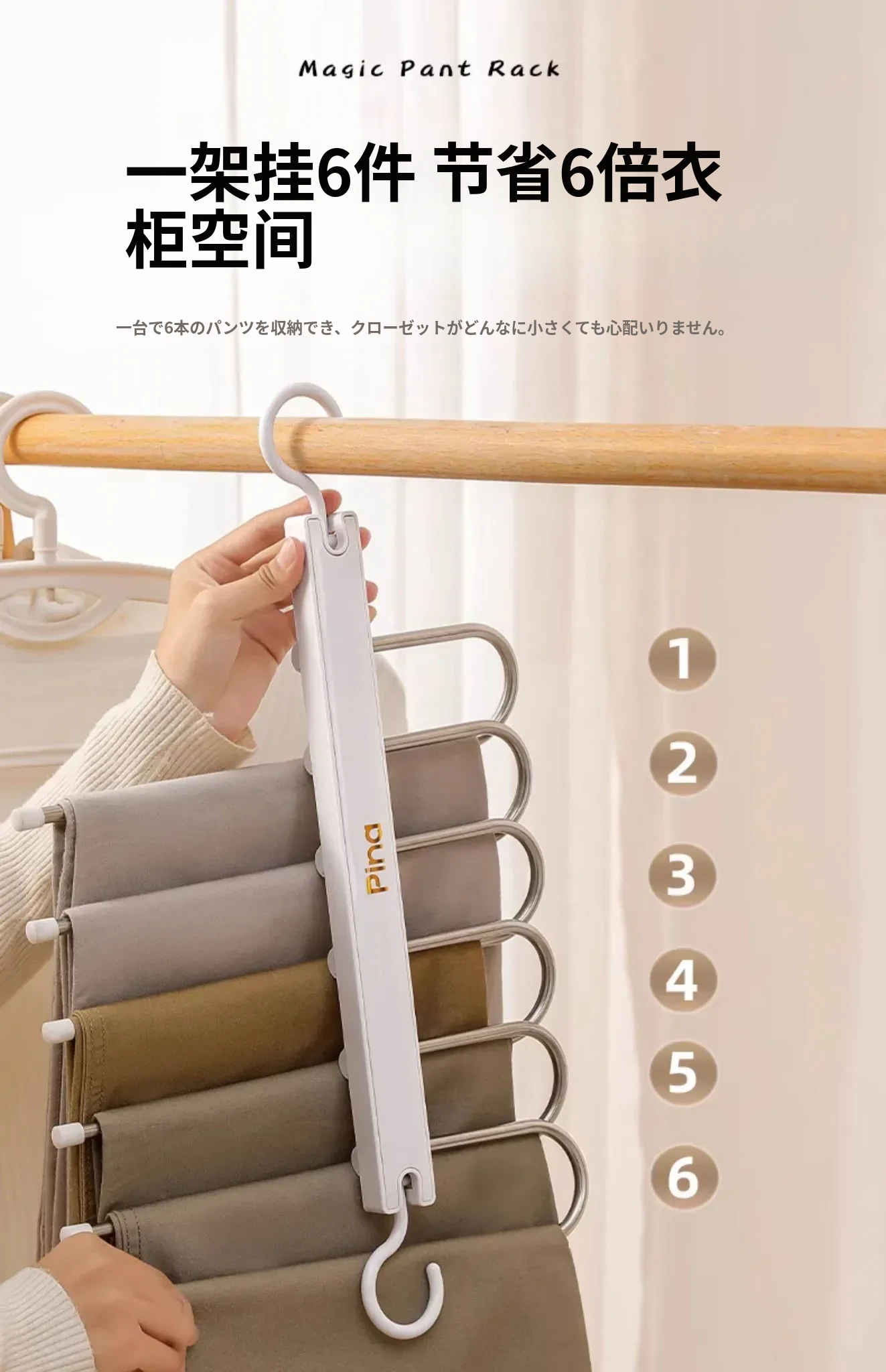 白色パンツハンガー【6本掛け可丨パンツパイプは取り外し可能】