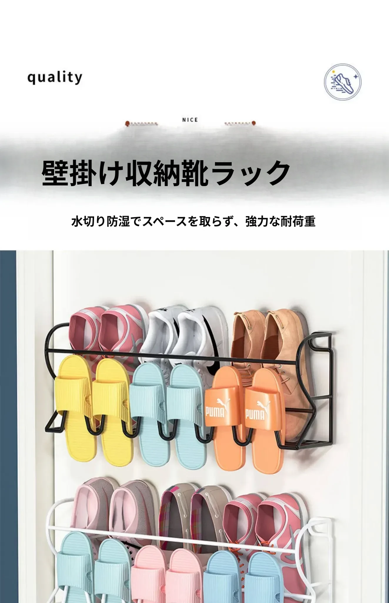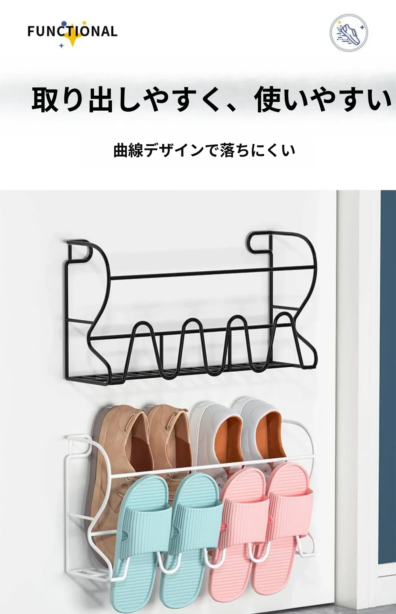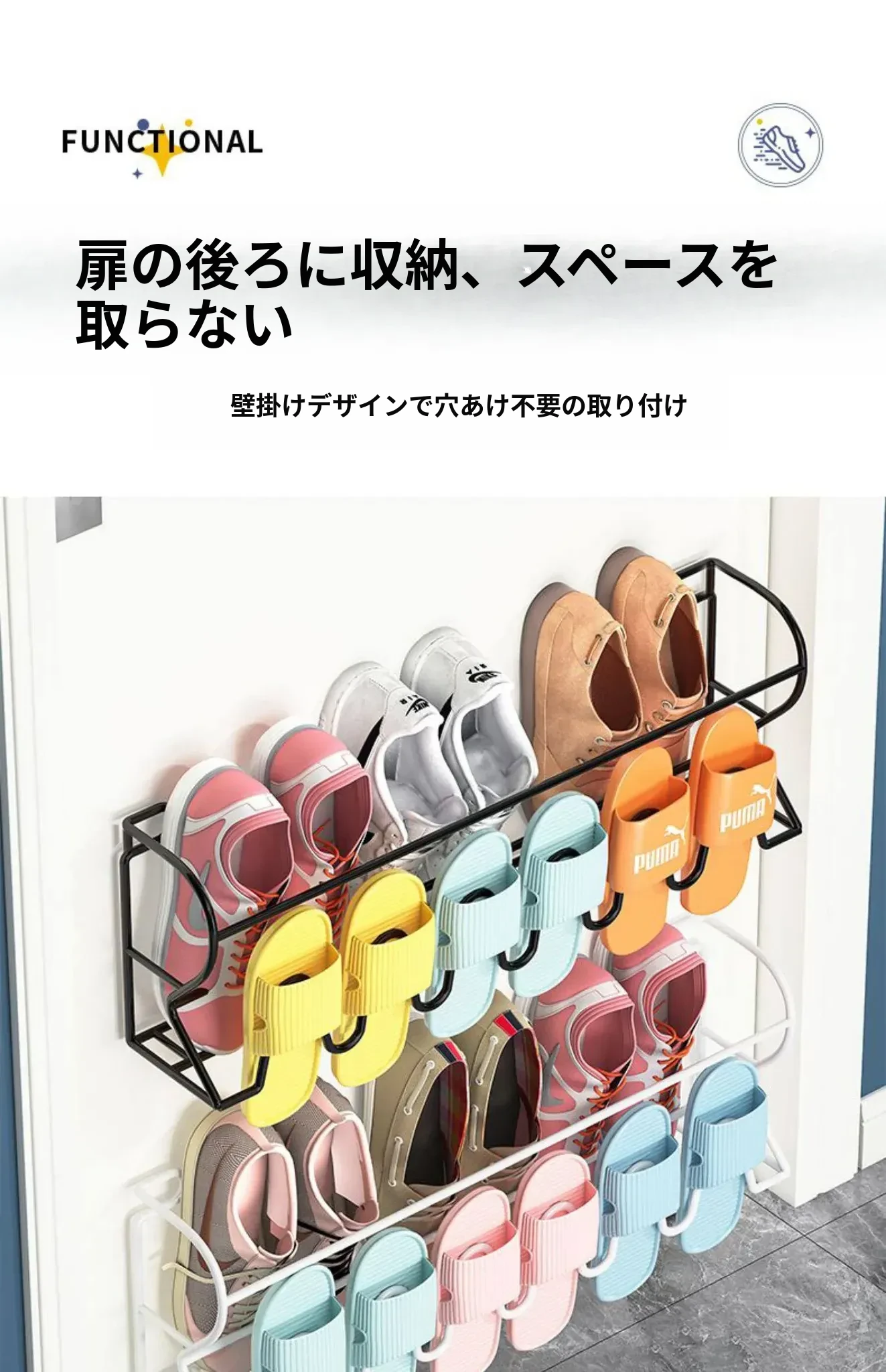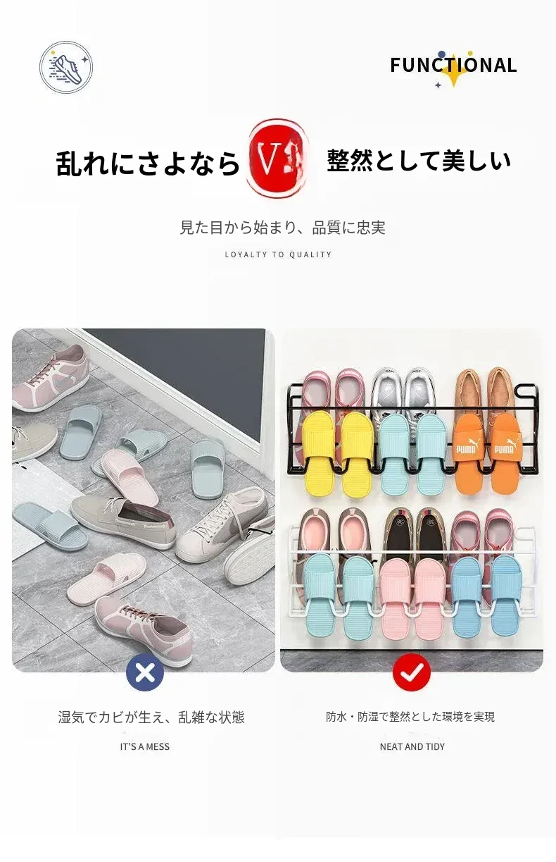 アイアン製ドアハンガーシューラック - 簡単取り付けで玄関やバスルームに最適!壁に穴を開けずに使える収納の魔法、ドアに掛けるだけでスペースを有効活用!