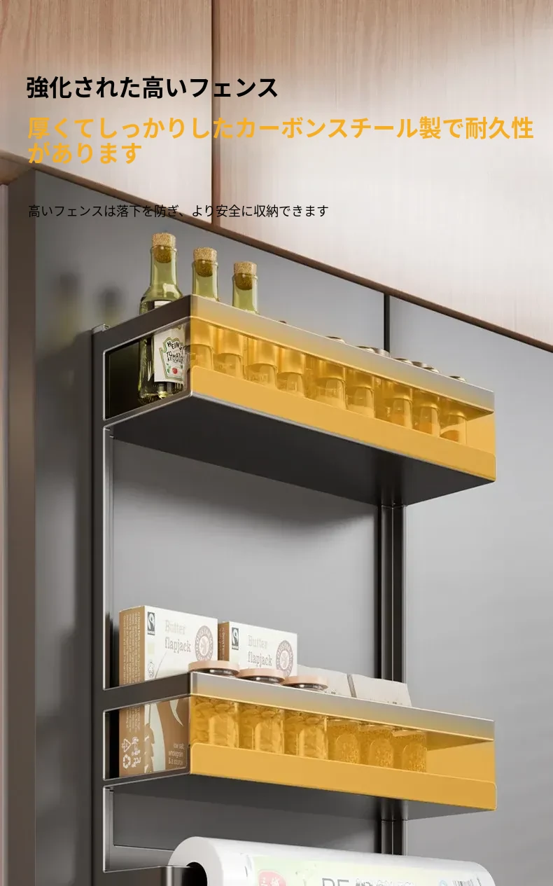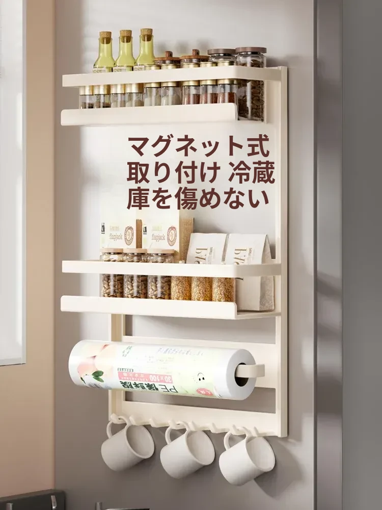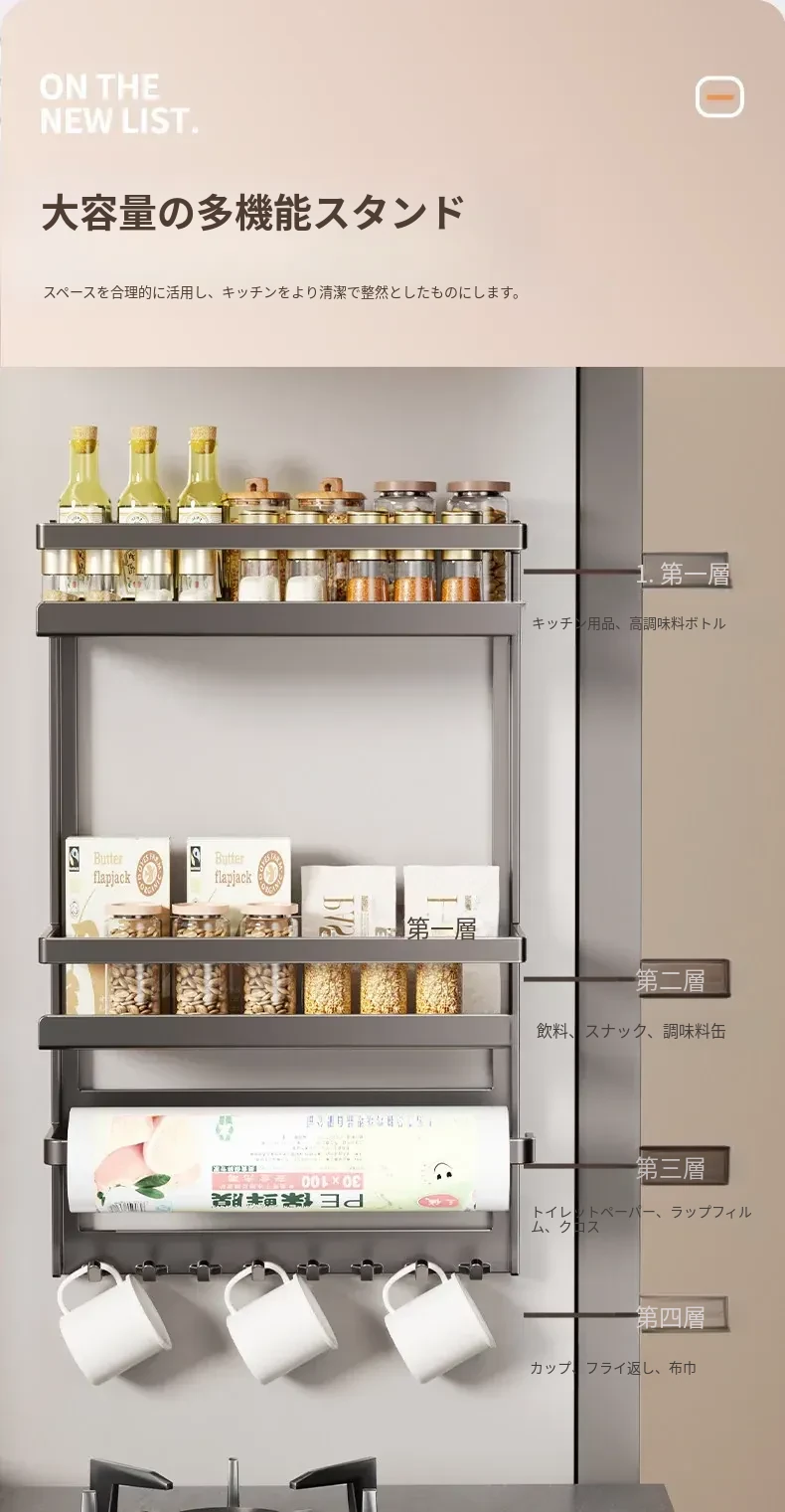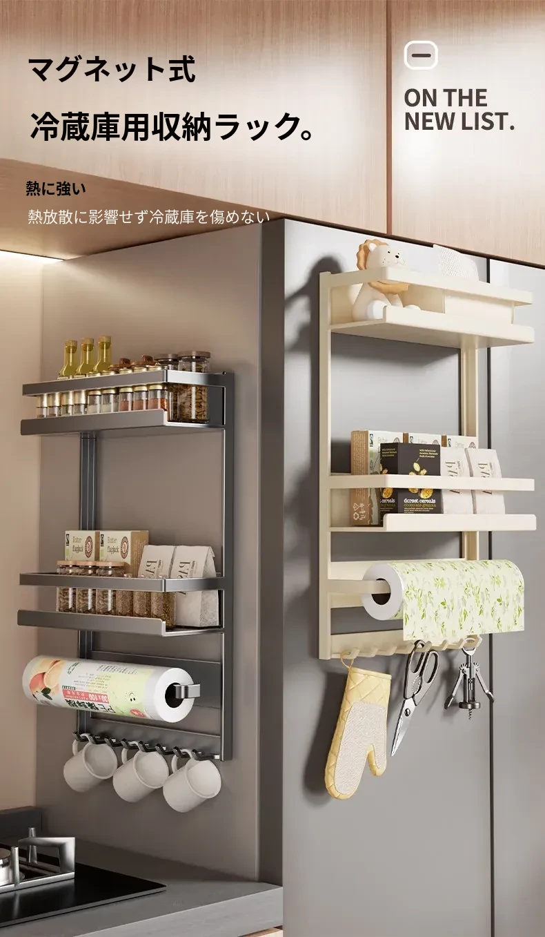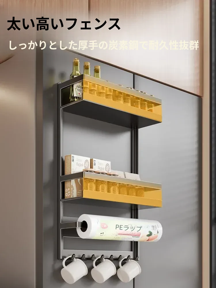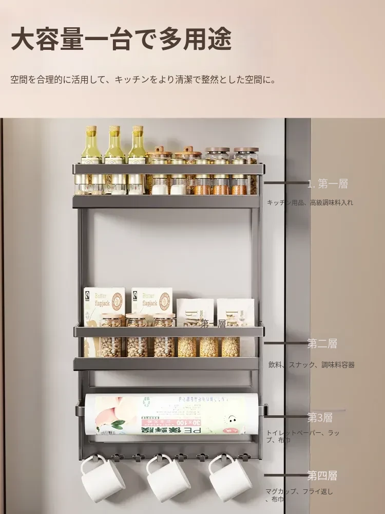 マグネット式冷蔵庫サイド収納ラック - キッチンでのスペースを有効活用!多層設計で隙間にぴったりフィット、便利な壁掛け収納。おしゃれで機能的な収納アイテム!