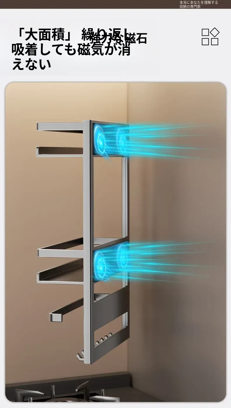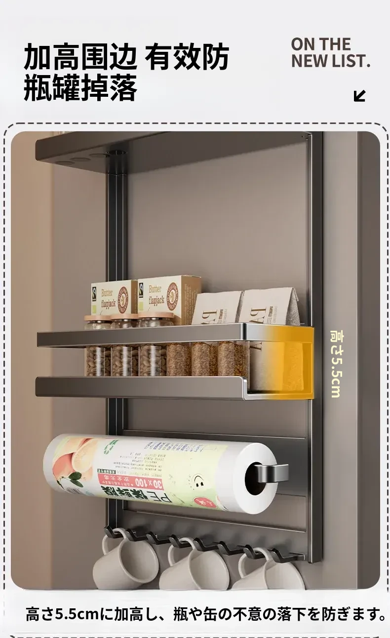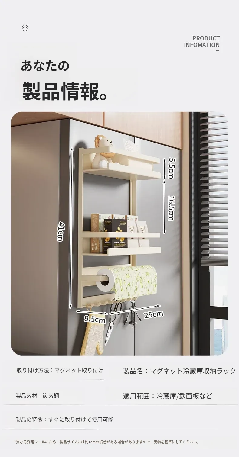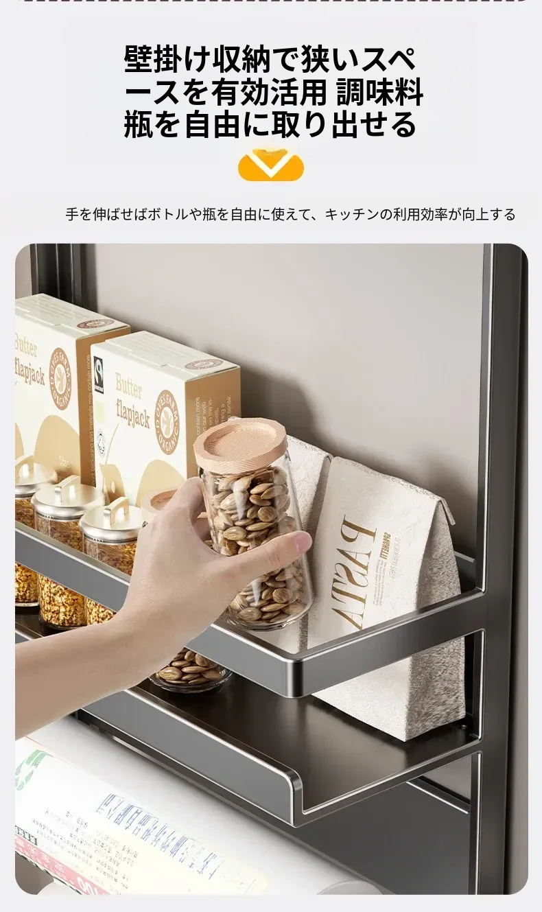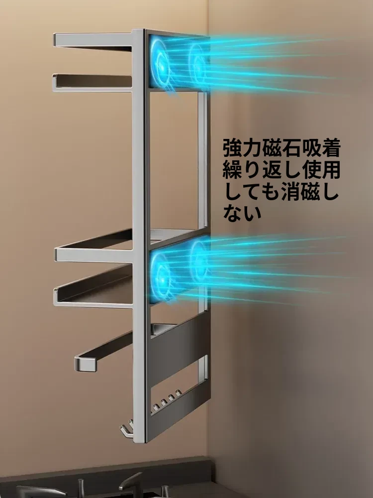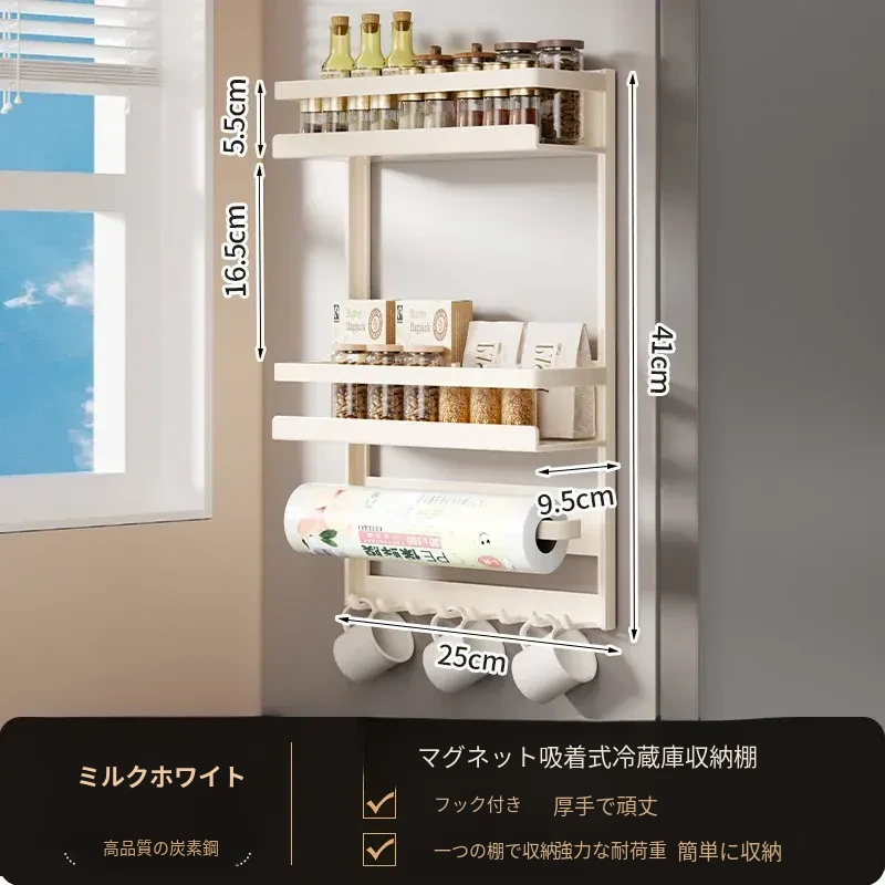 マグネット式冷蔵庫サイド収納ラック - キッチンでのスペースを有効活用!多層設計で隙間にぴったりフィット、便利な壁掛け収納。おしゃれで機能的な収納アイテム!
