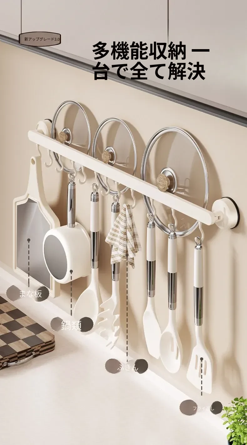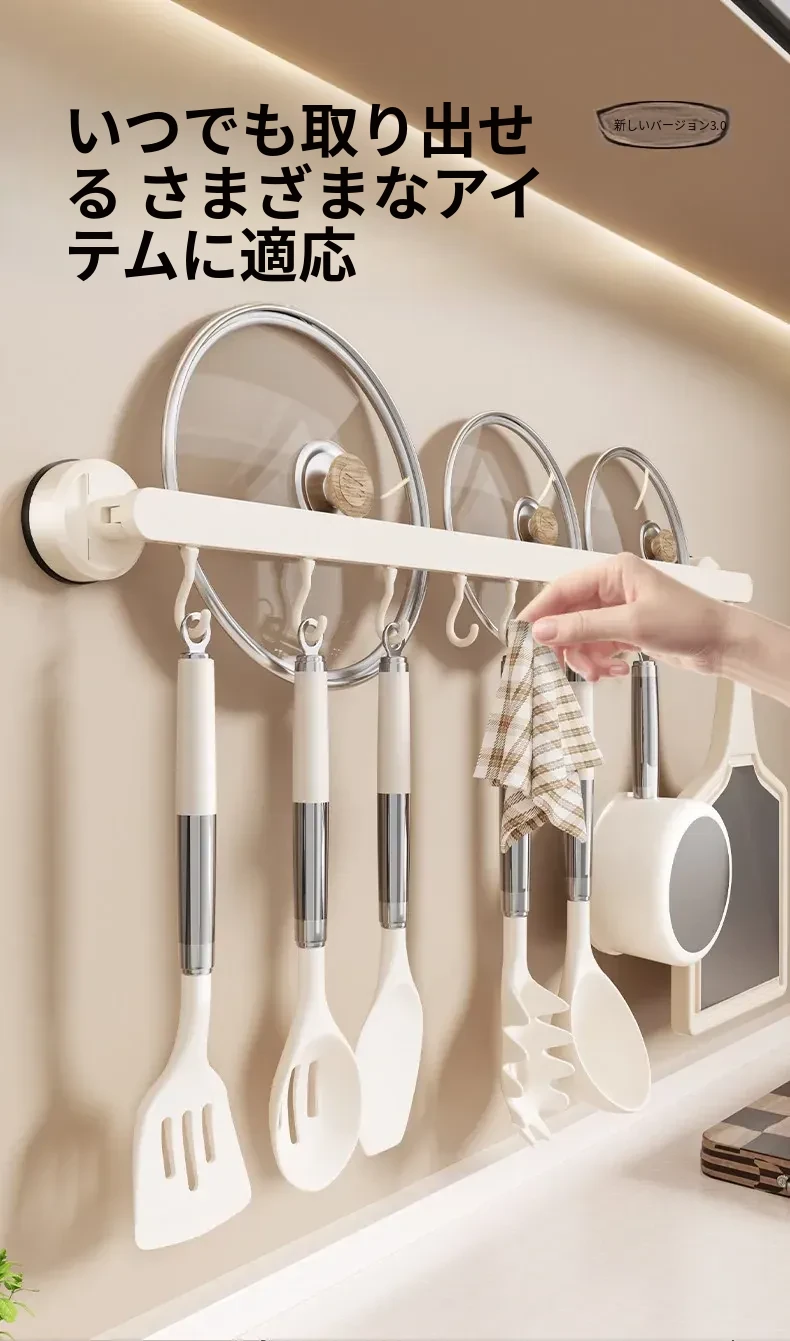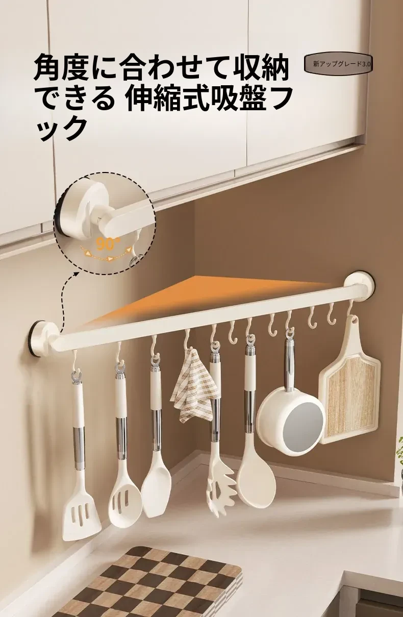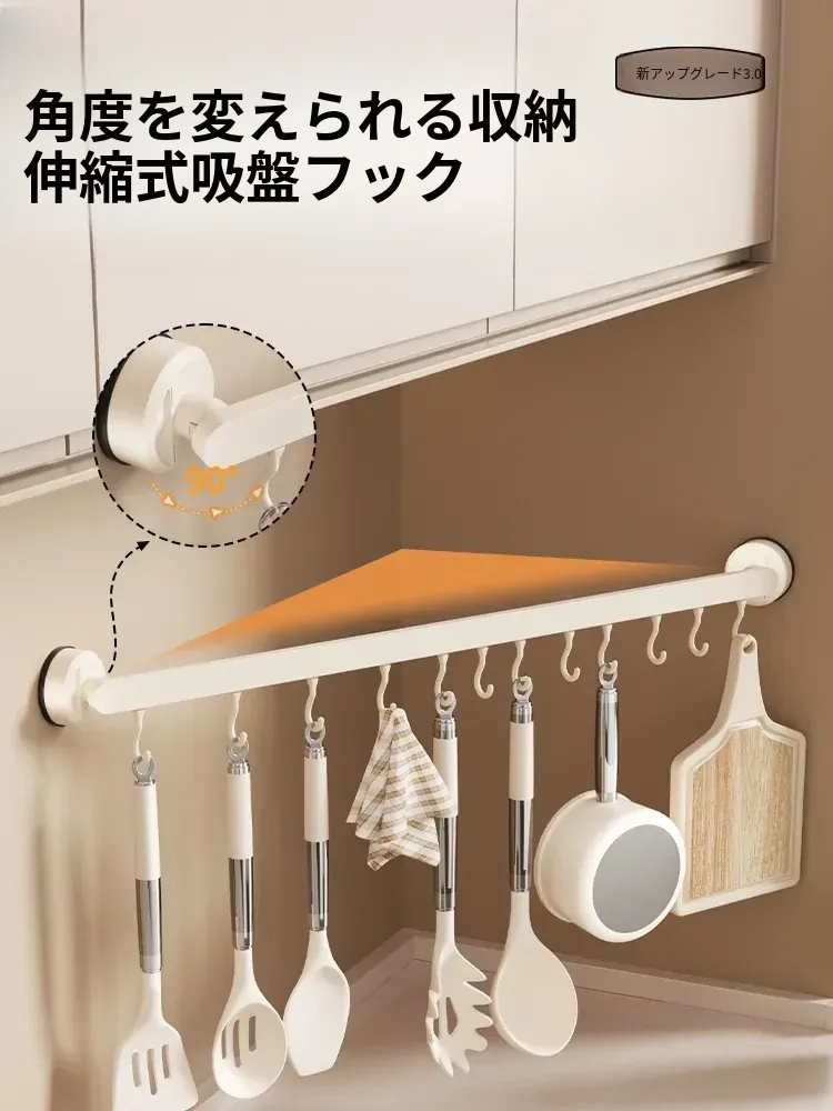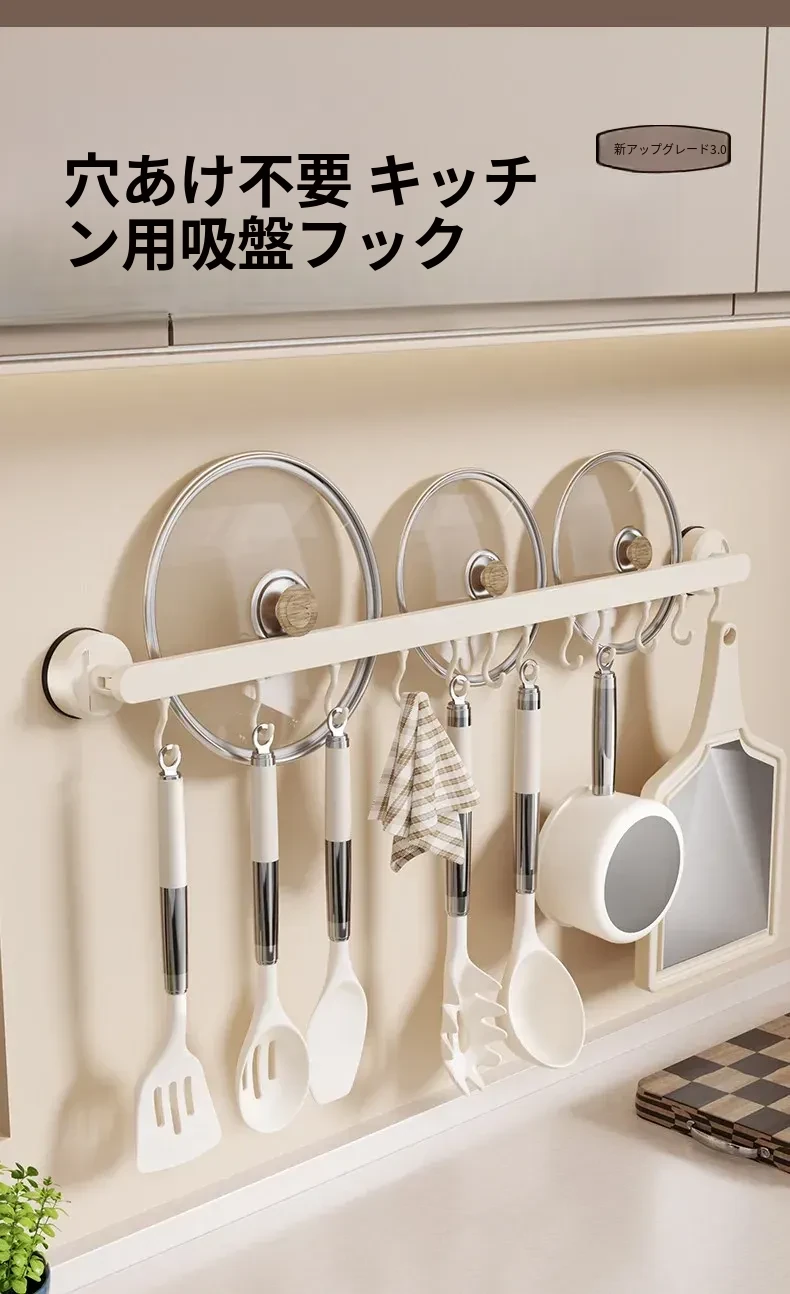 『おしゃれなナチュラルホワイト 吸盤式キッチンフック 穴なしコーナーハンガー 壁掛け調理器具収納ラック スプーンやヘラの整理に最適!』