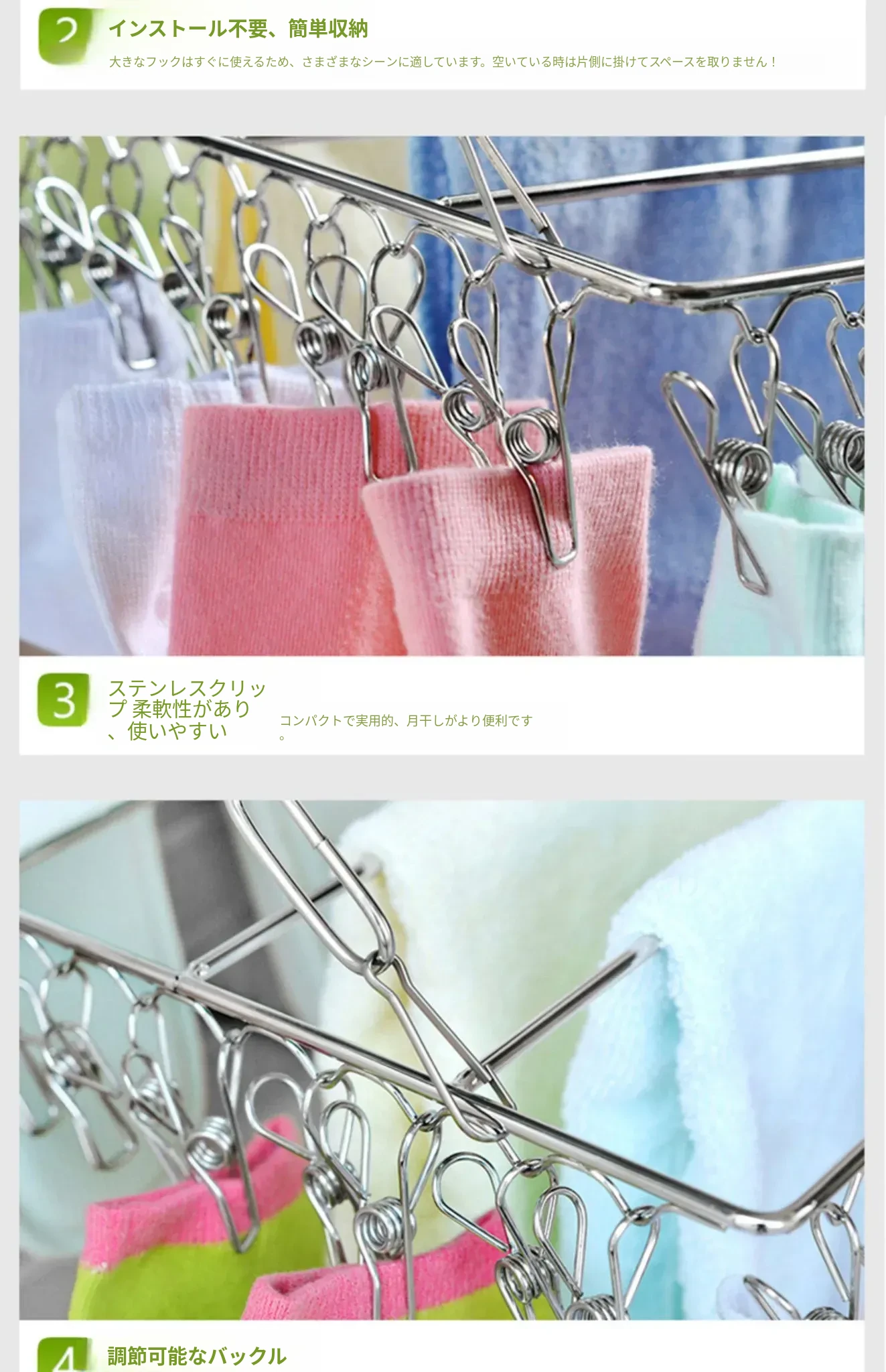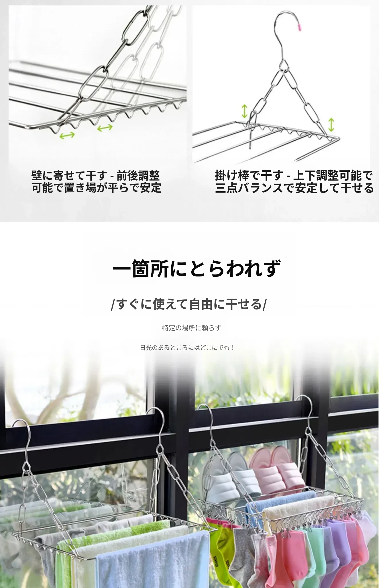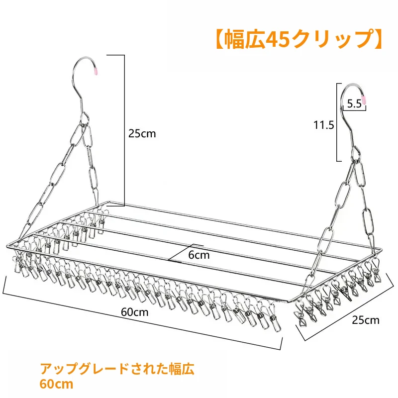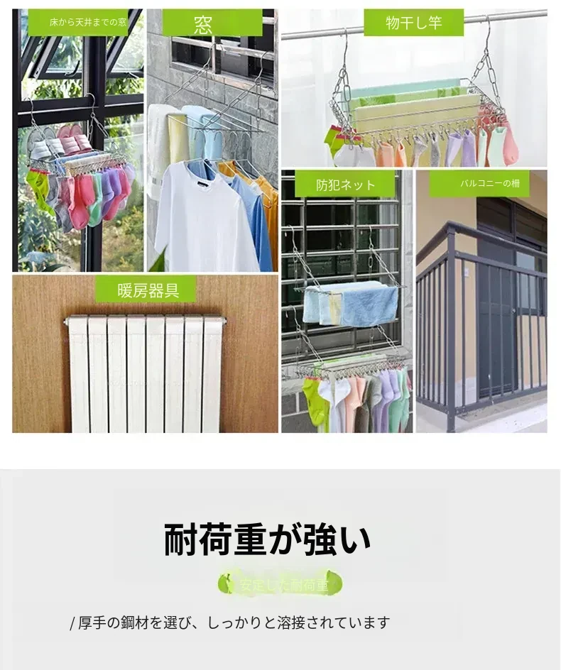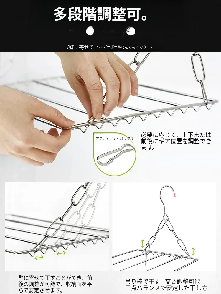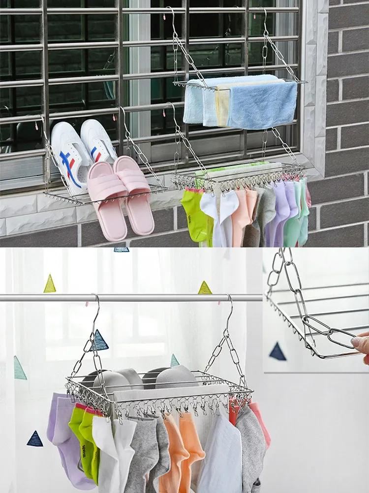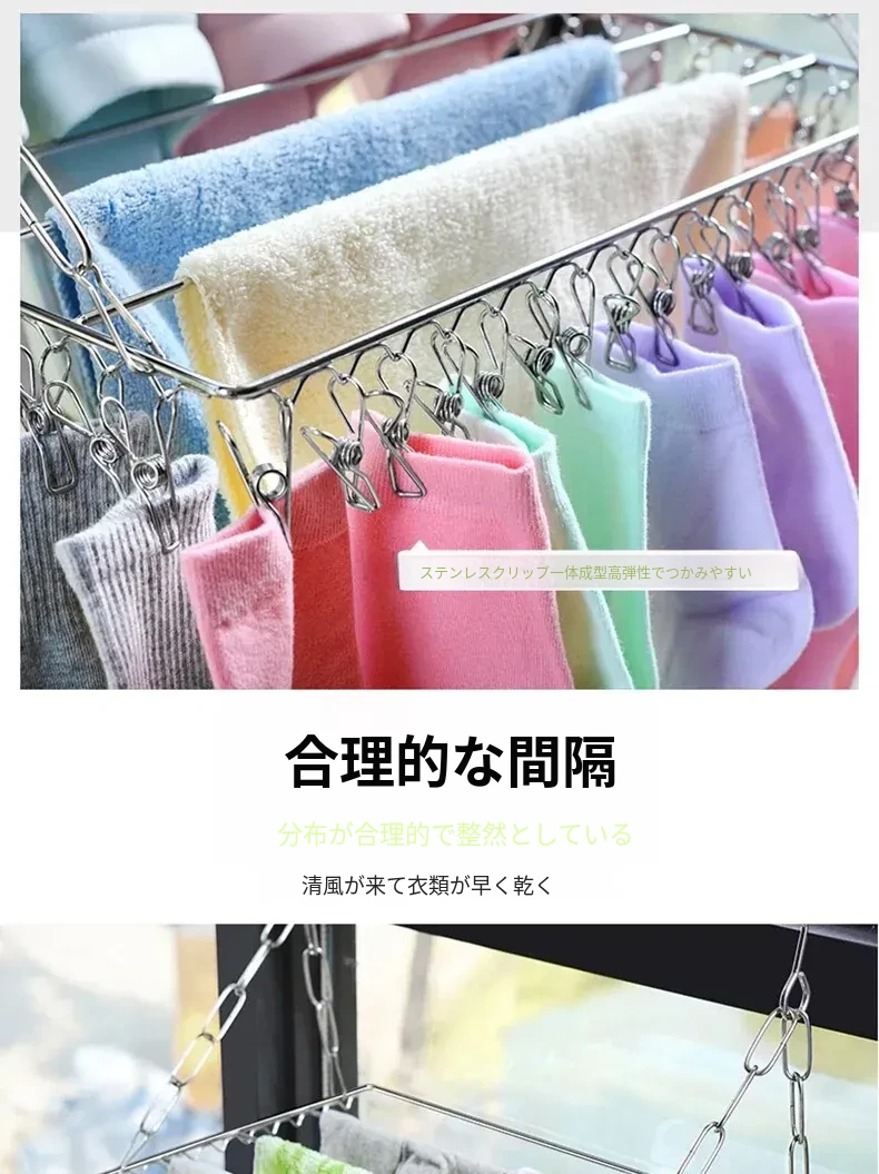 ステンレス製の多機能物干しハンガー!靴下や靴をしっかり干せるクリップ付き、家庭用の便利な衣類掛け。省スペースでおしゃれなデザイン、衣類の乾燥が簡単に!