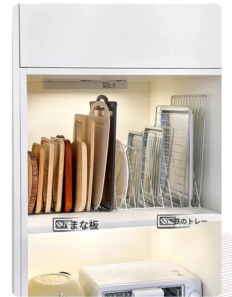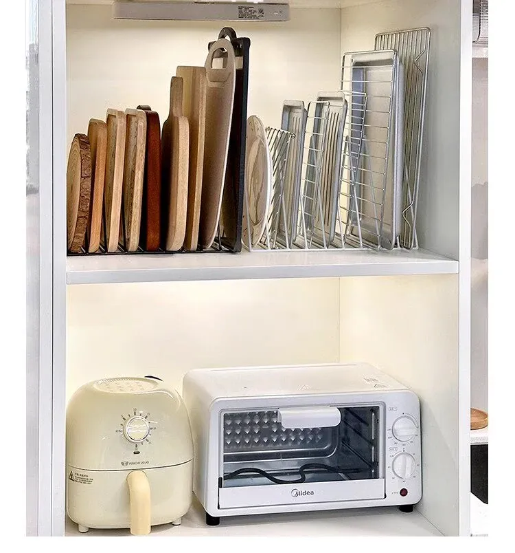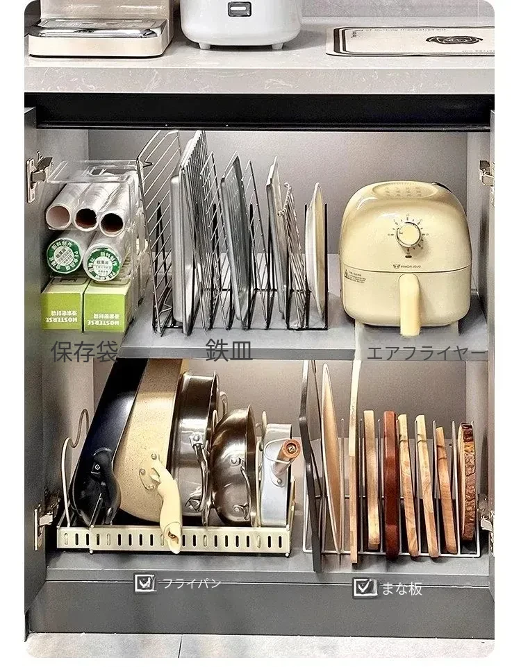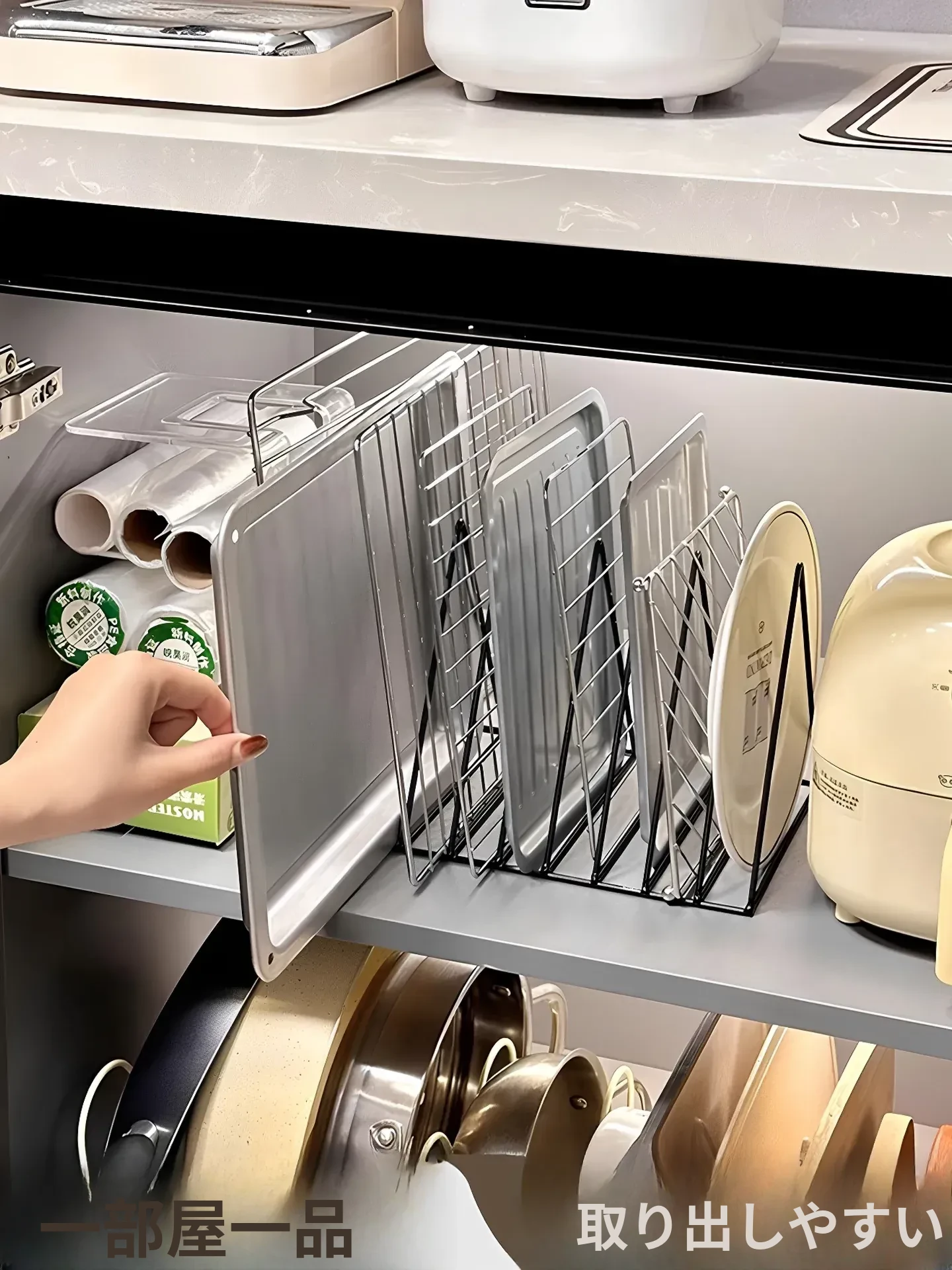 キッチン収納の必需品!多機能仕切りラック - オーブン皿やまな板もすっきり整理!内側の棚でスペースを有効活用し、使いやすさ抜群の分層収納でお料理をもっと楽しく!