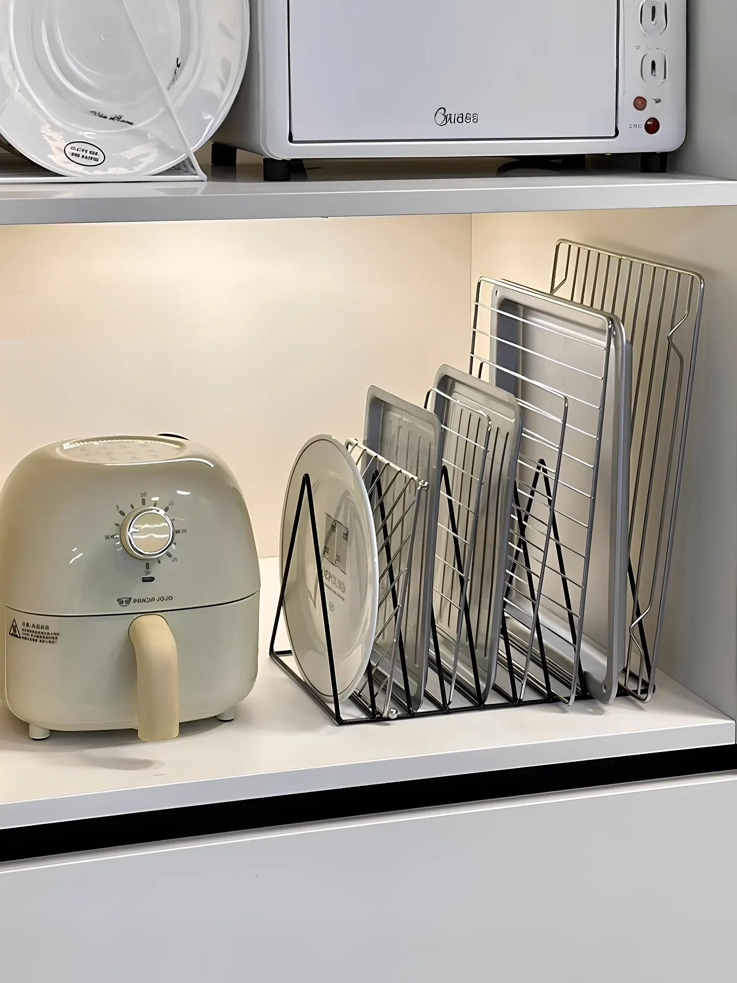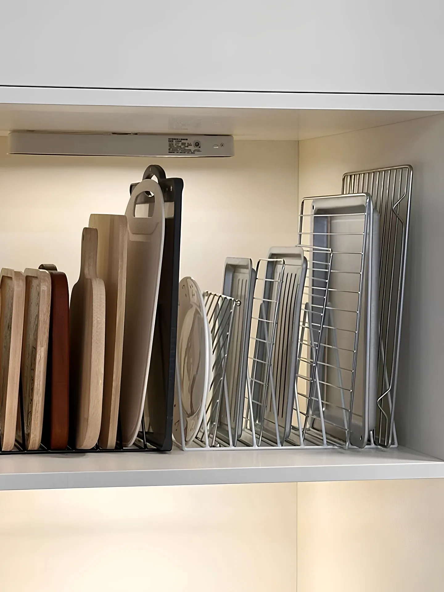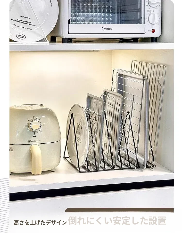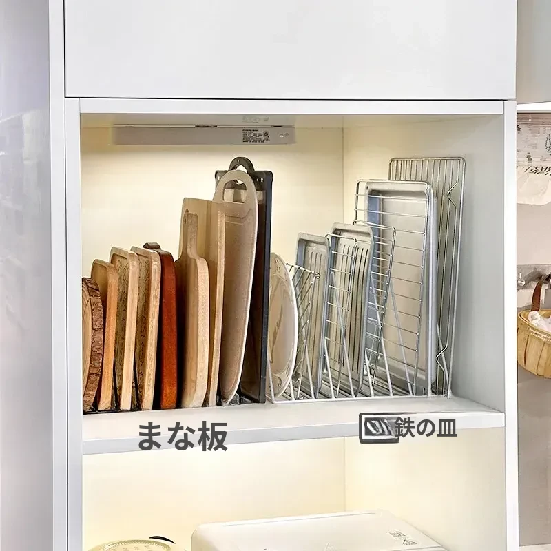 キッチン収納の必需品!多機能仕切りラック - オーブン皿やまな板もすっきり整理!内側の棚でスペースを有効活用し、使いやすさ抜群の分層収納でお料理をもっと楽しく!