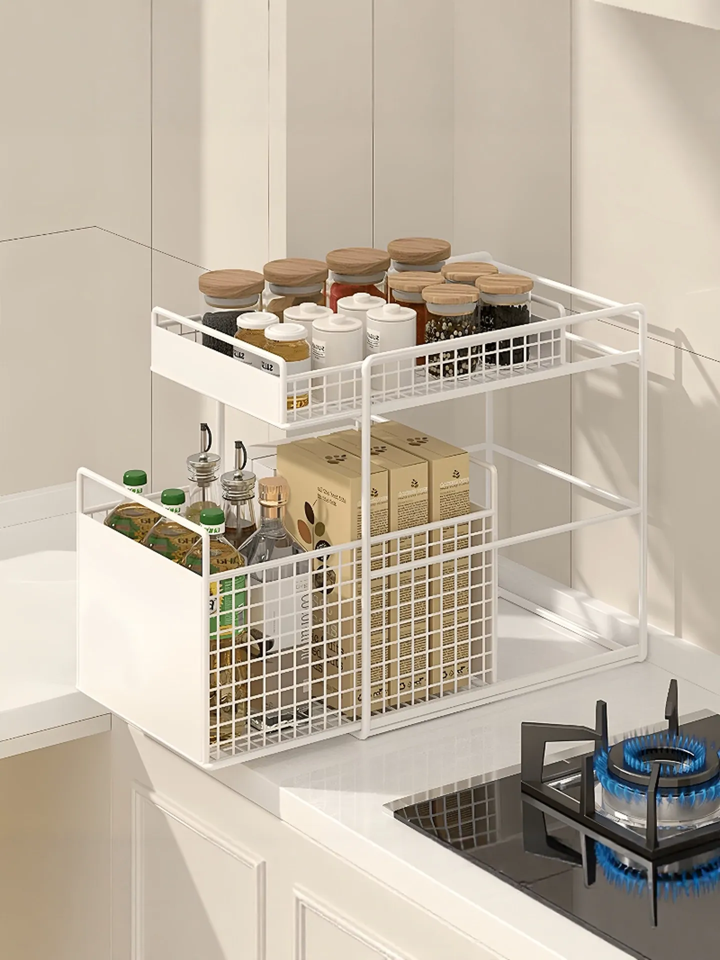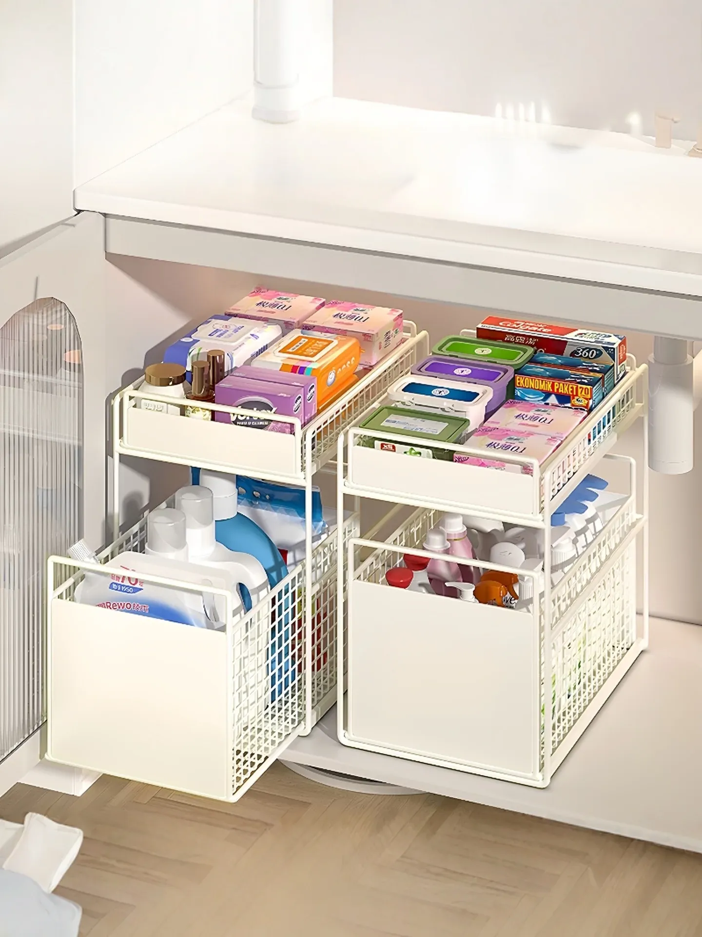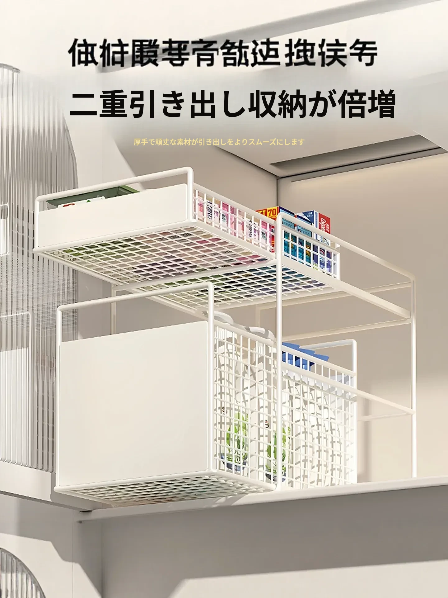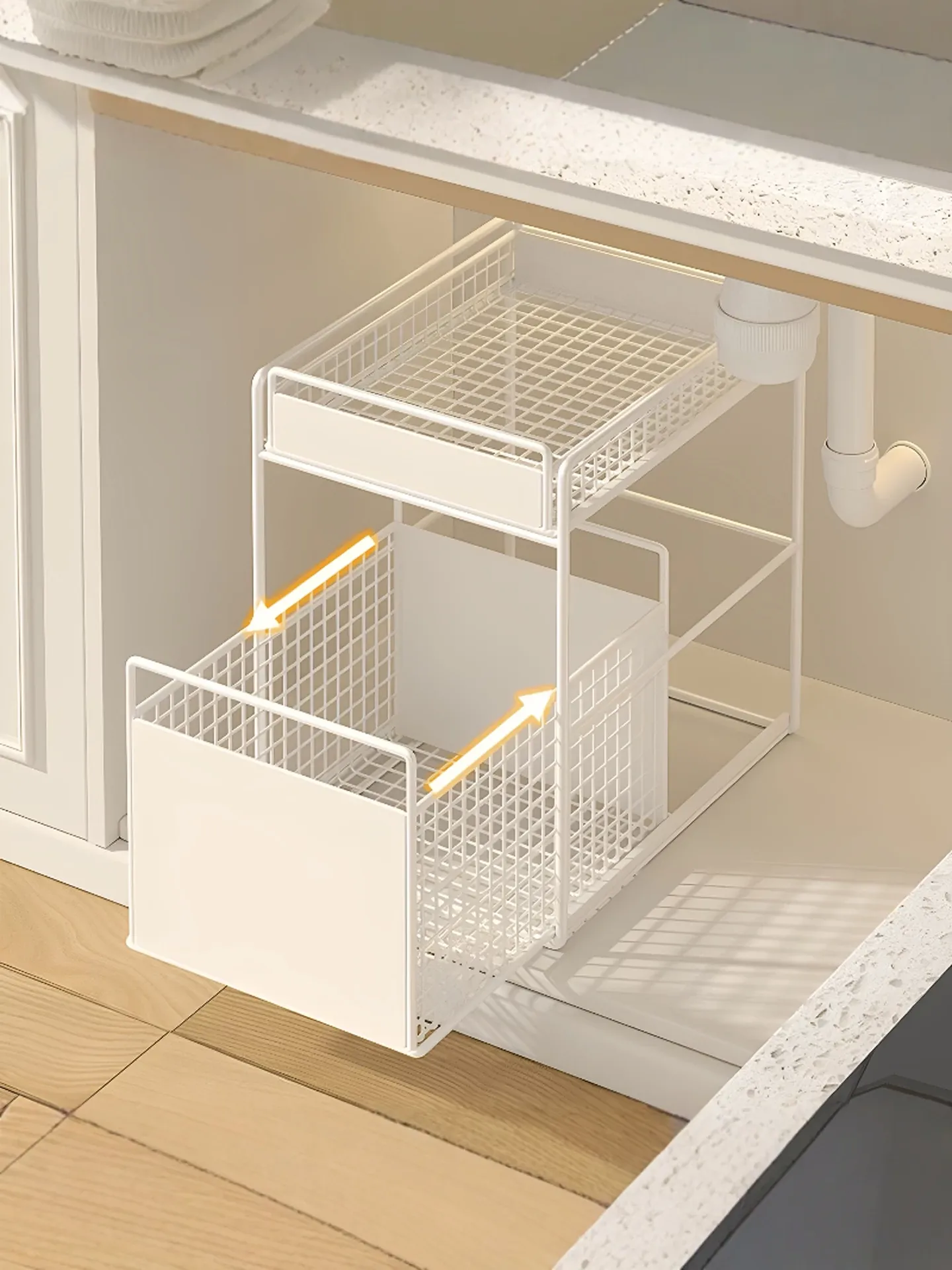 バスルームキャビネット下水槽用収納ラック キッチン引き出し式多段階専用ラタンバスケット トイレ収納分別ラックで、スッキリ整理整頓!あなたの生活空間を美しく整えます!