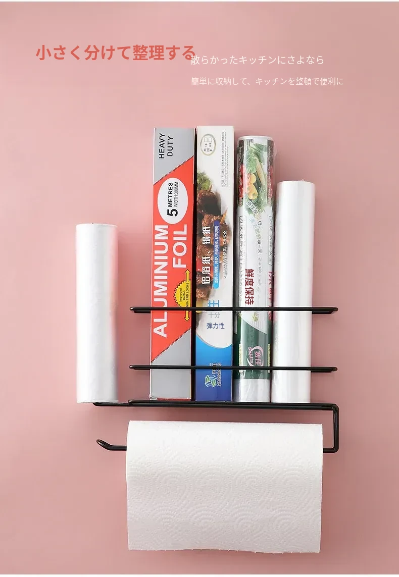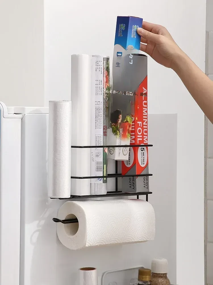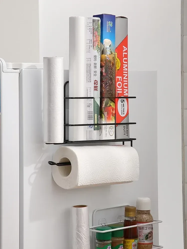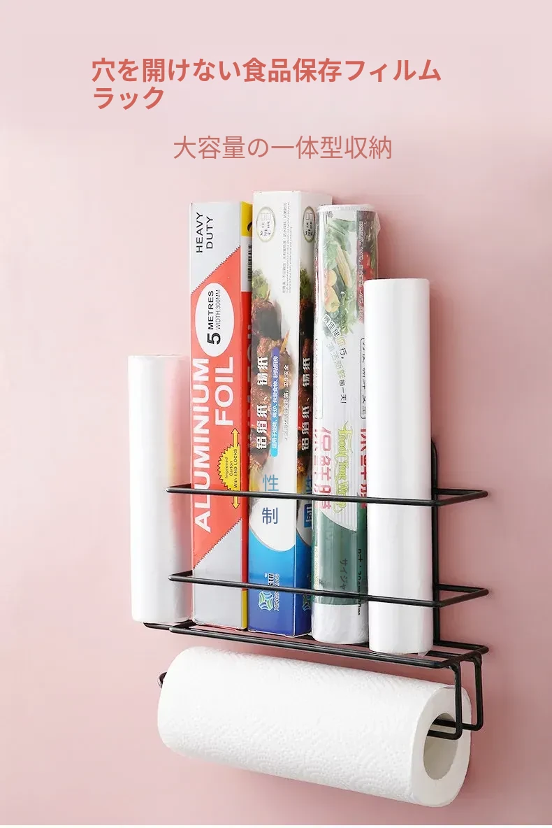 穴あけ不要!冷蔵庫横にぴったりフィットする保存袋&キッチンペーパー収納ラック - スペースを有効活用して、すっきりとしたキッチンを実現!