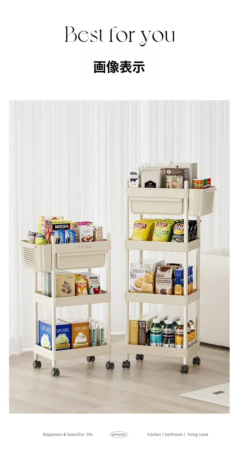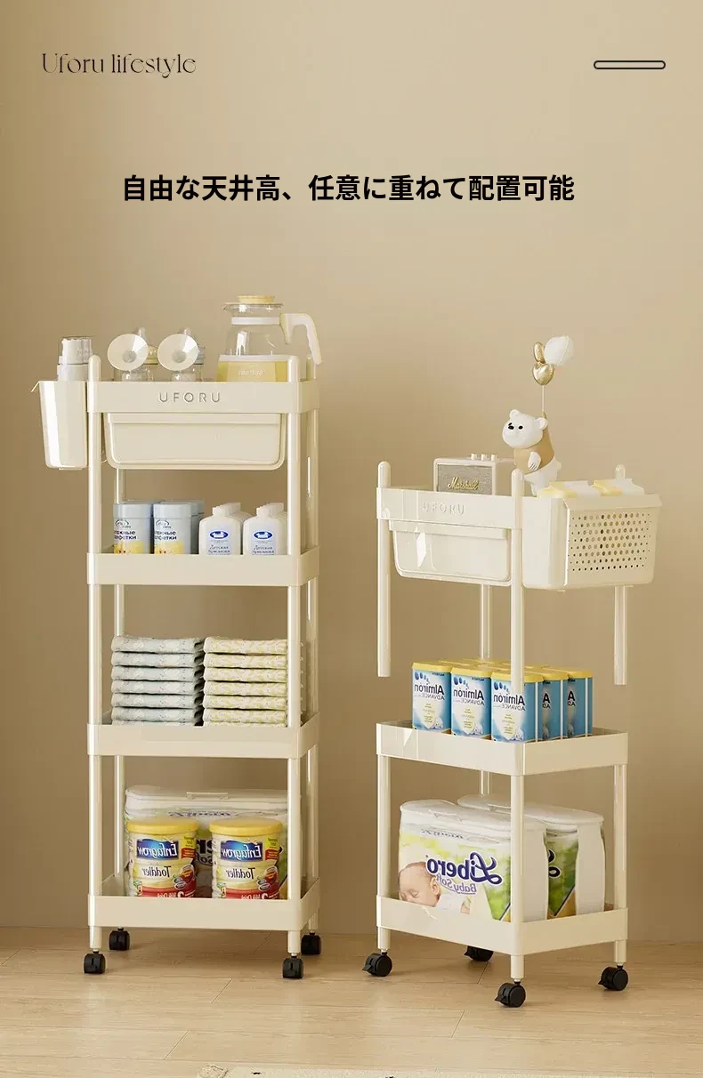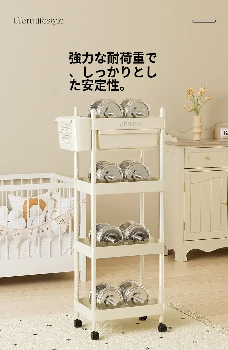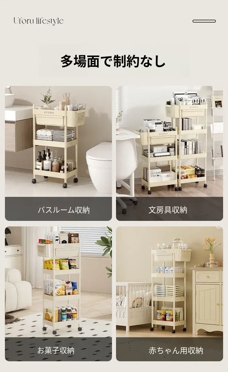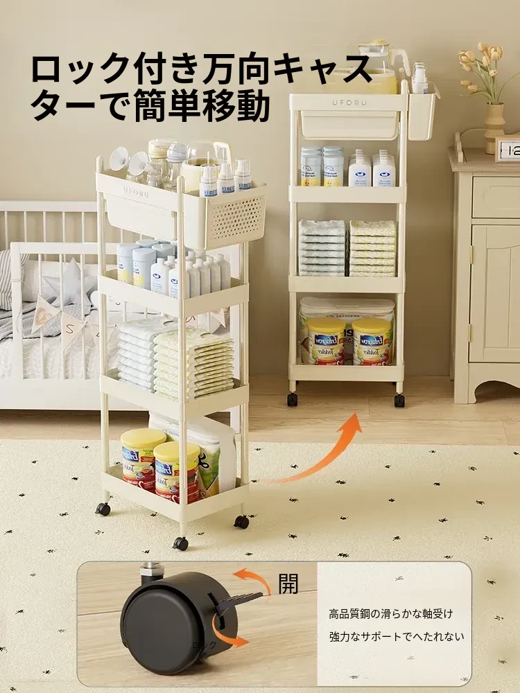 クリームホワイト-4段【引き出し+バスケット付き】移動キャスター