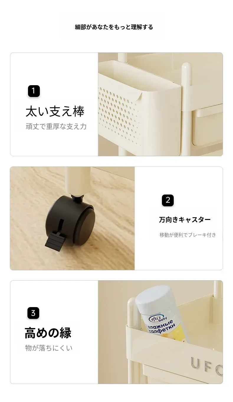 クリームホワイト-3段【引き出し+バスケット付き】移動キャスター