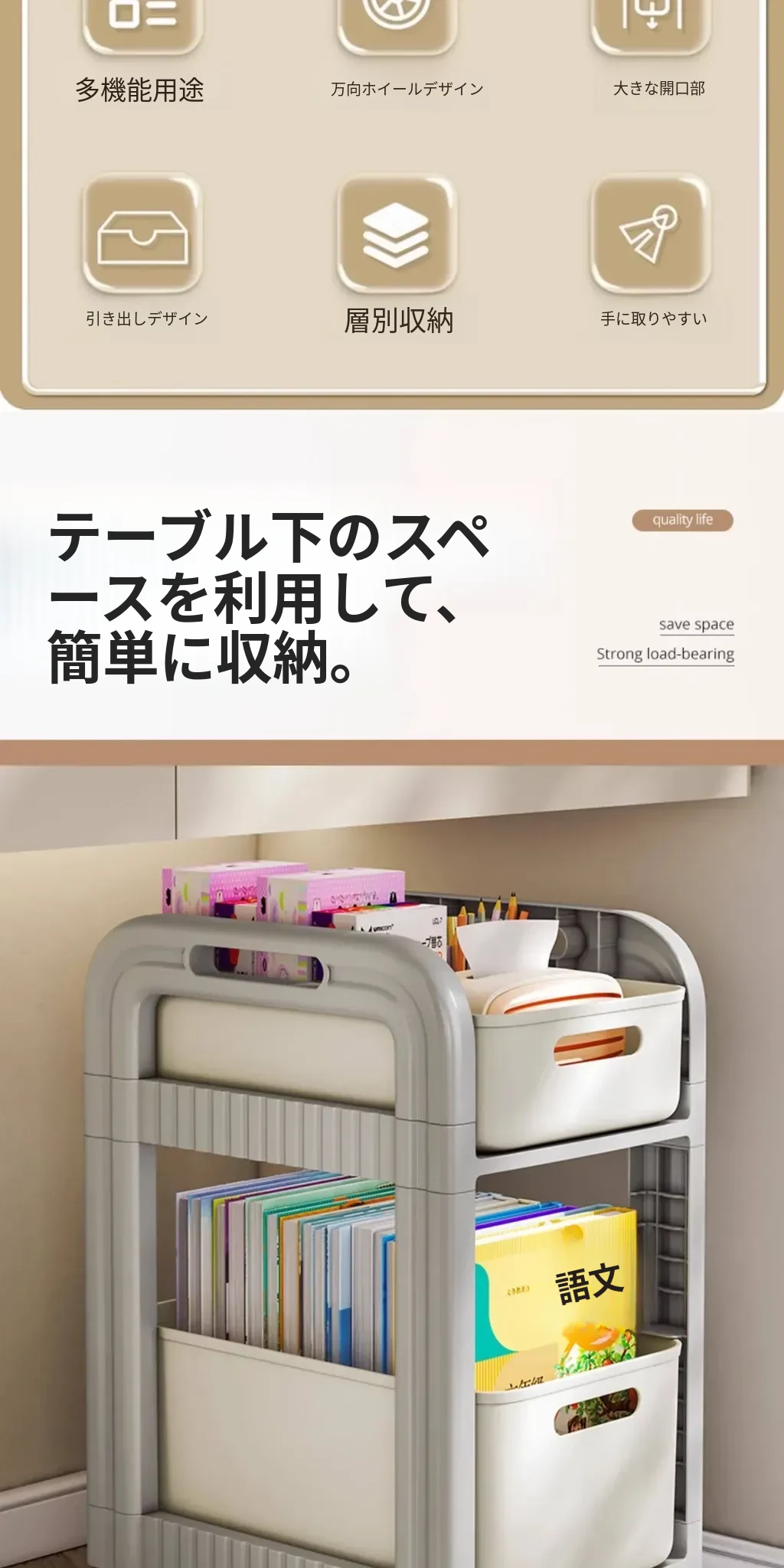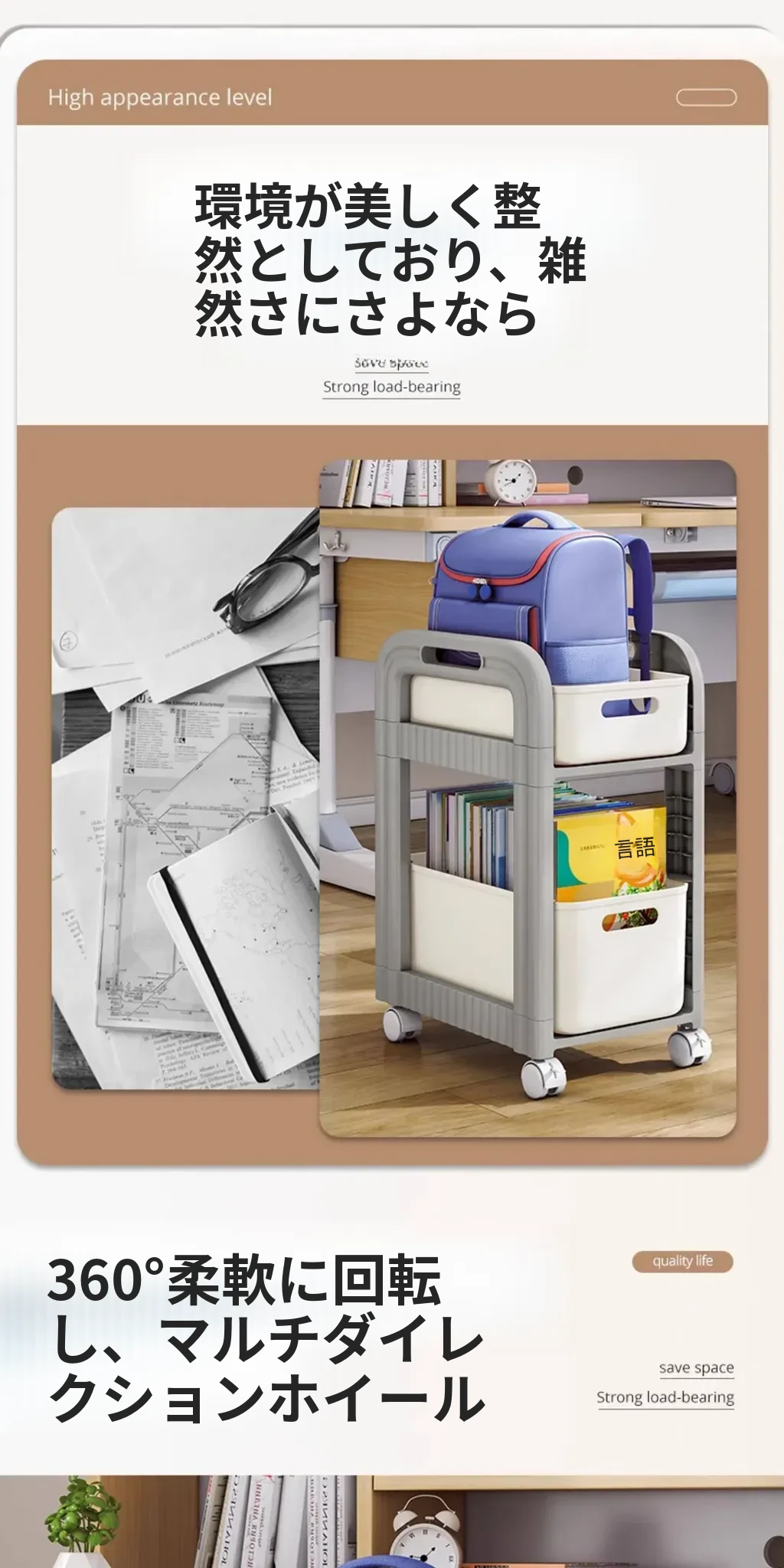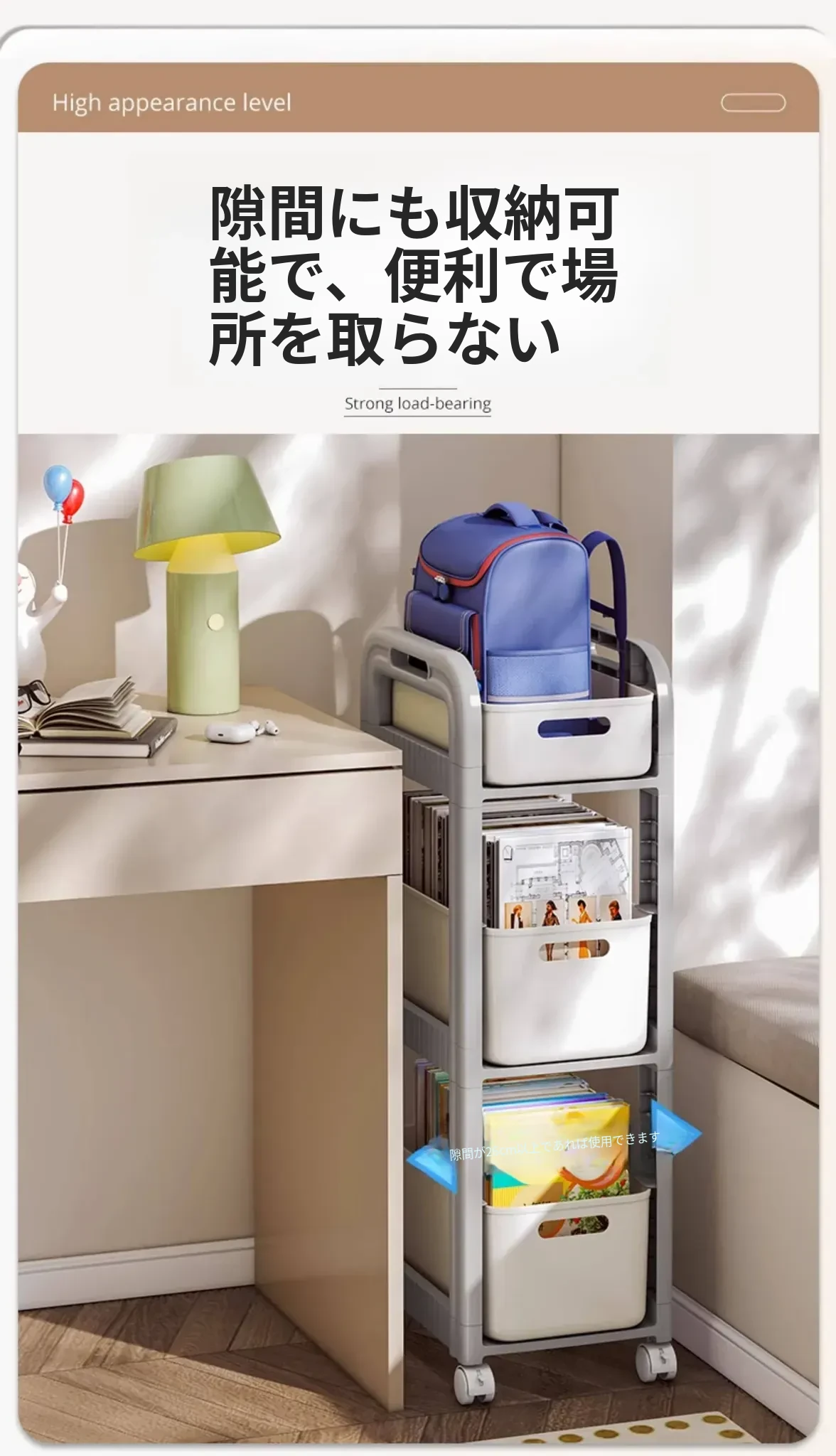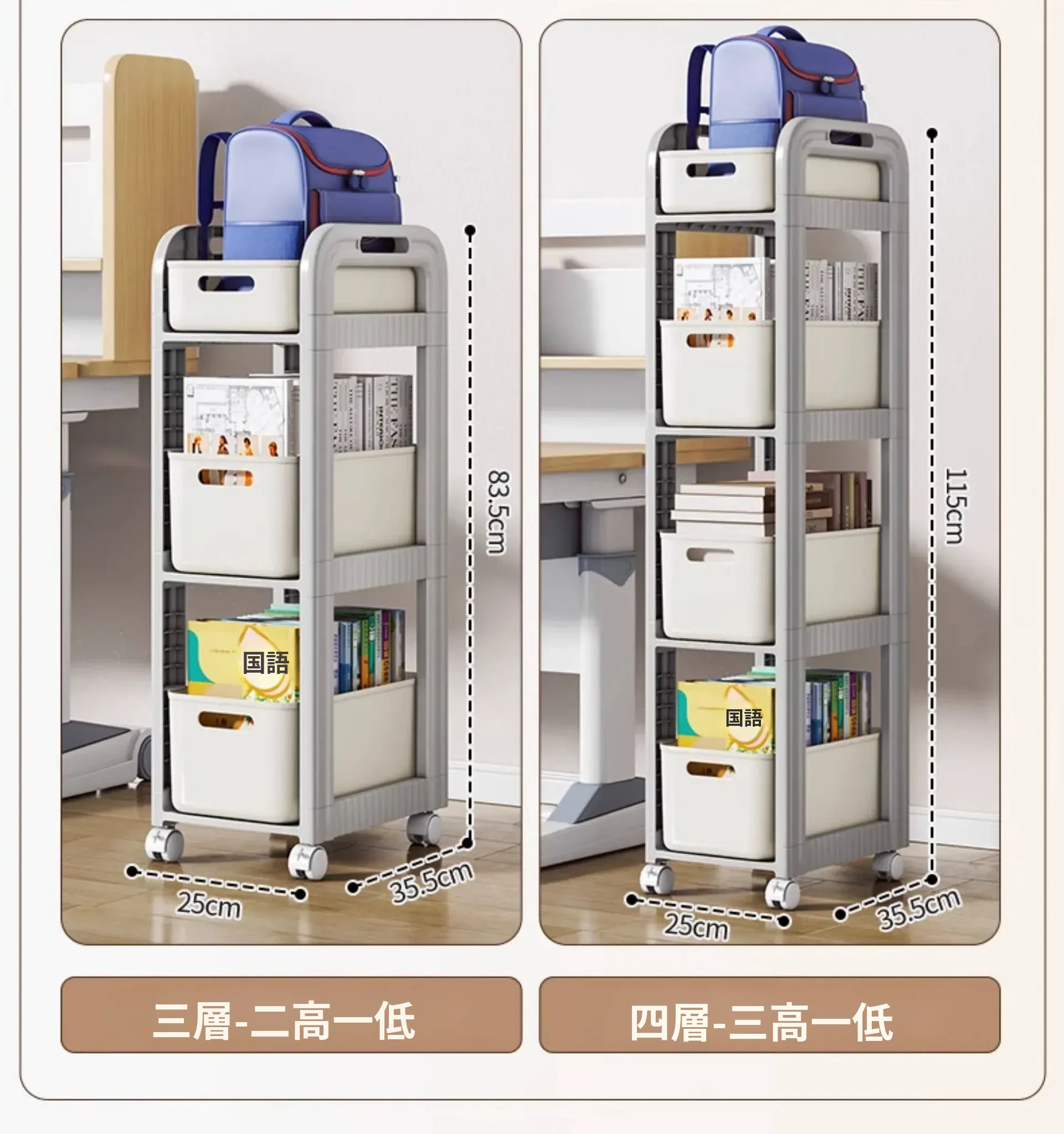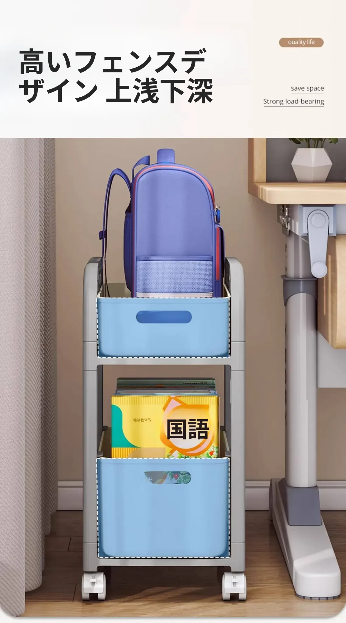 移動式ブックシェルフキャスター付き!デスク下にピッタリな収納ラックで、勉強道具や本をすっきり整理!学習効率アップの必需品です。