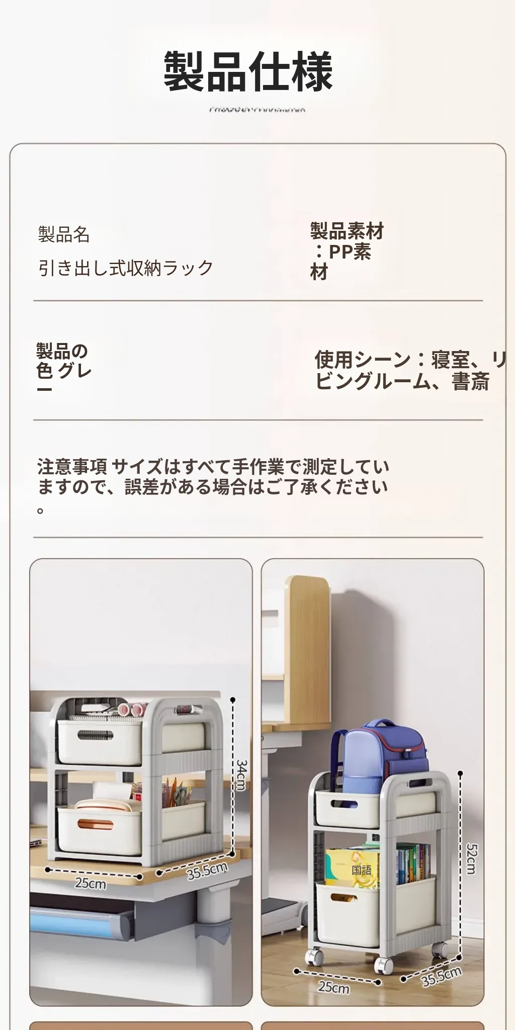【キャスター付きタイプ】グレー3段大サイズ-4つのキャスター付き