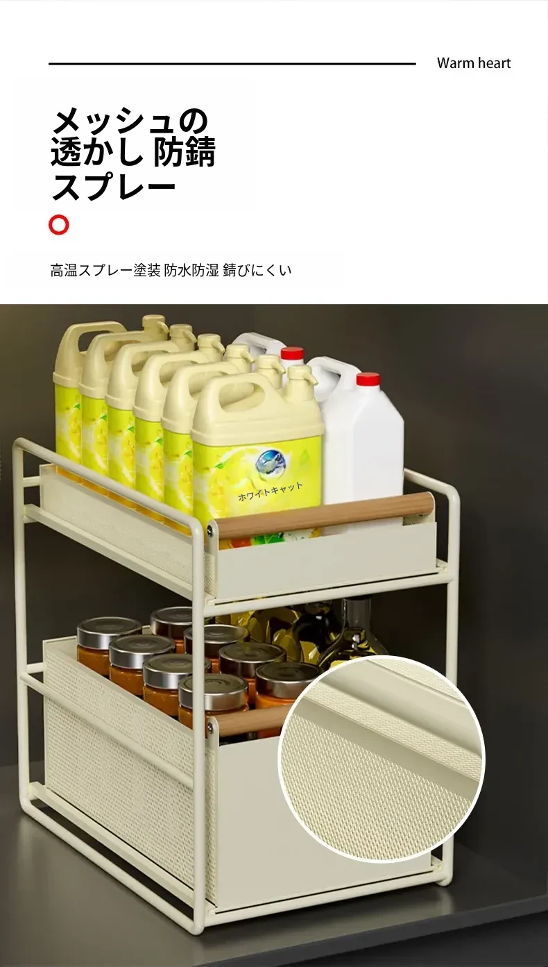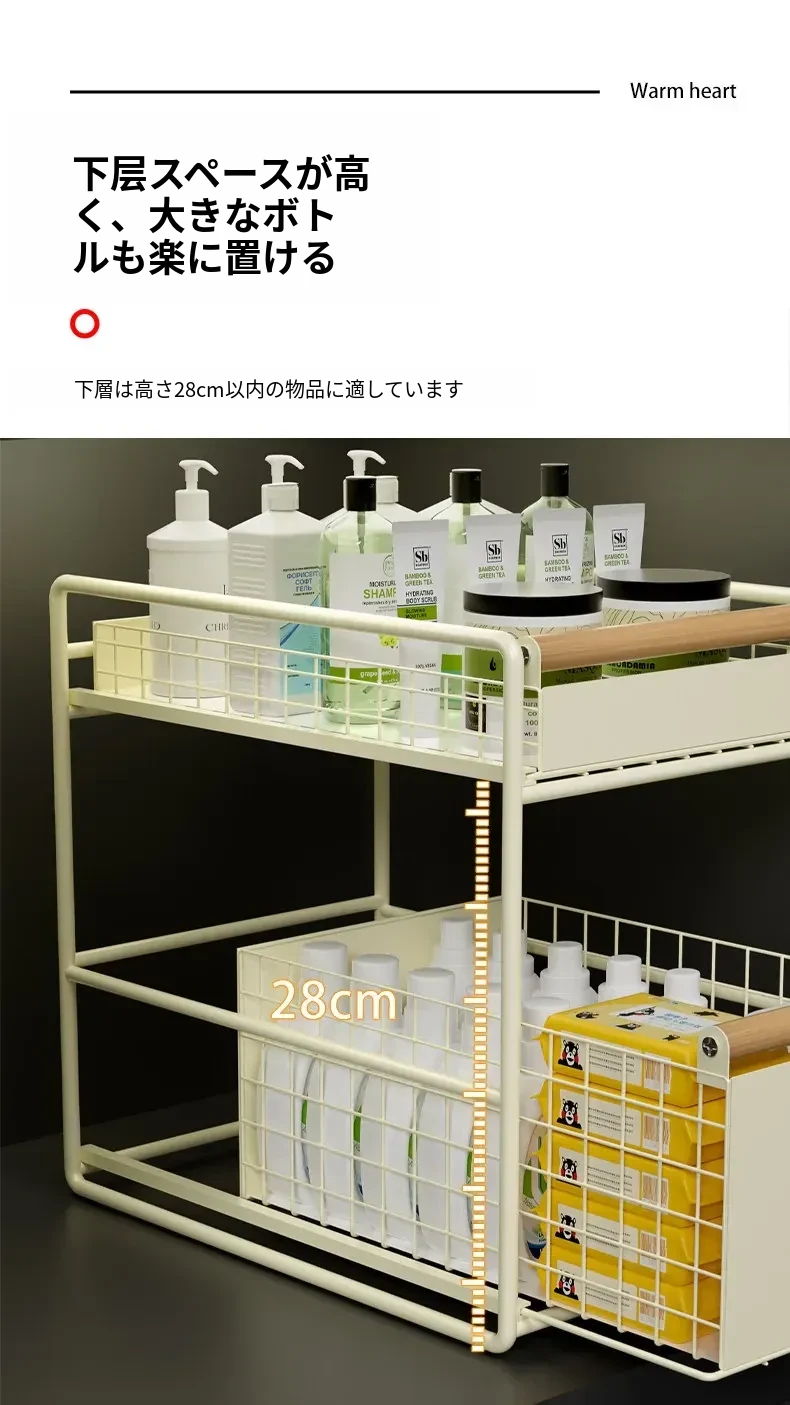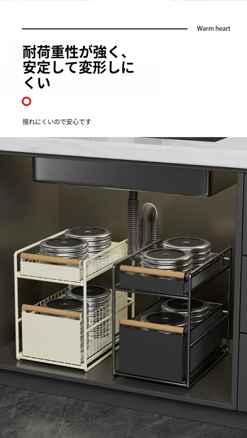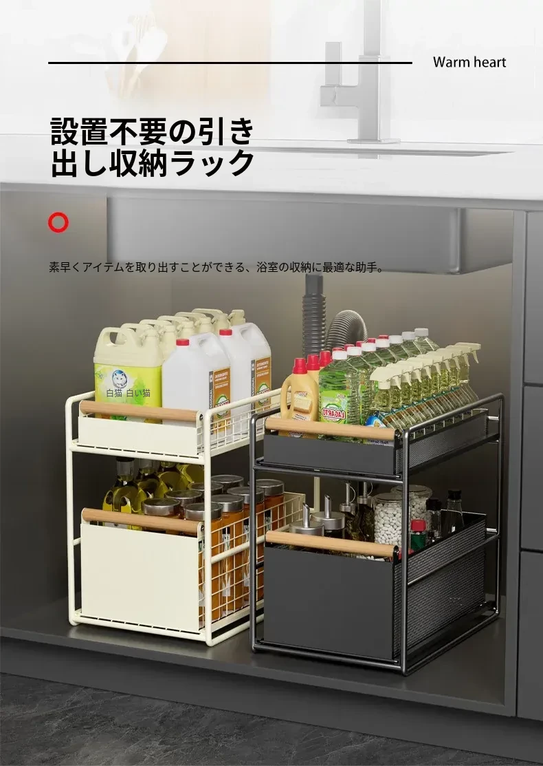 キッチン・バスルーム用下水槽引き出し式収納ラック|多層収納バスケットでスッキリ整理!キャビネット内のスペースを有効活用し、機能的でおしゃれな収納を実現。