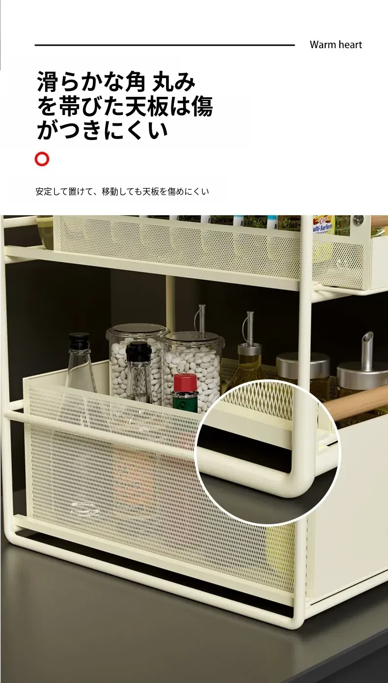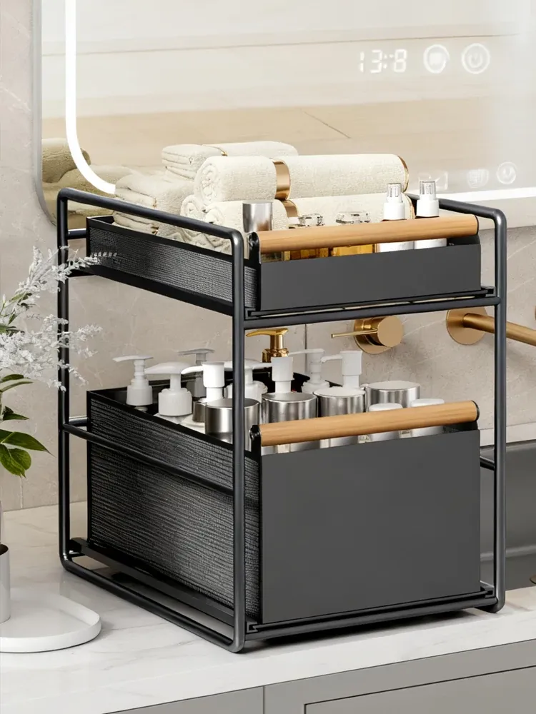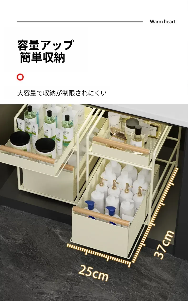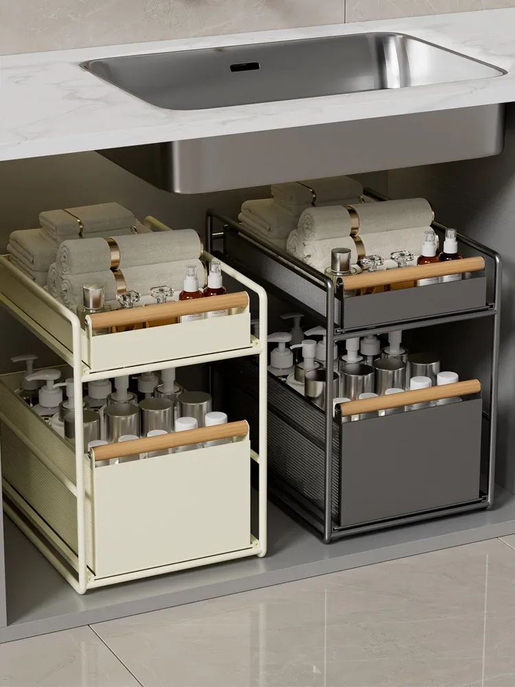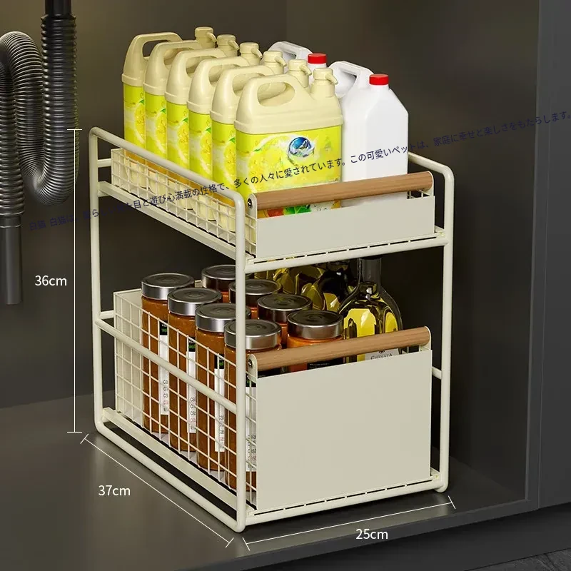 キッチン・バスルーム用下水槽引き出し式収納ラック|多層収納バスケットでスッキリ整理!キャビネット内のスペースを有効活用し、機能的でおしゃれな収納を実現。