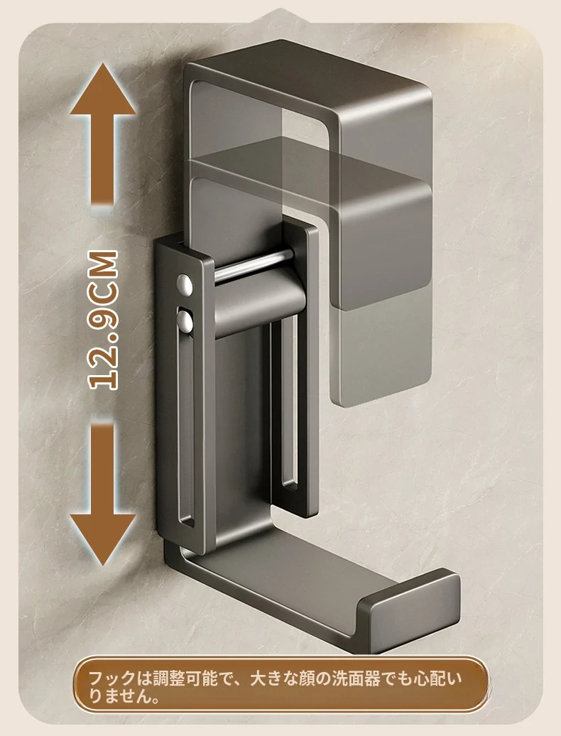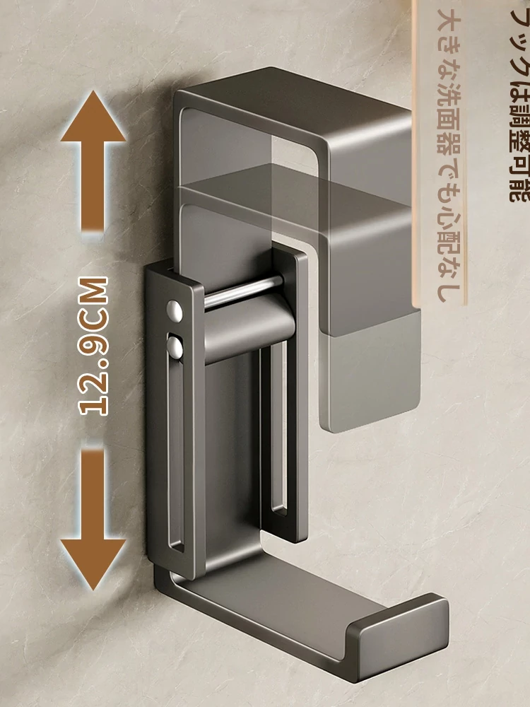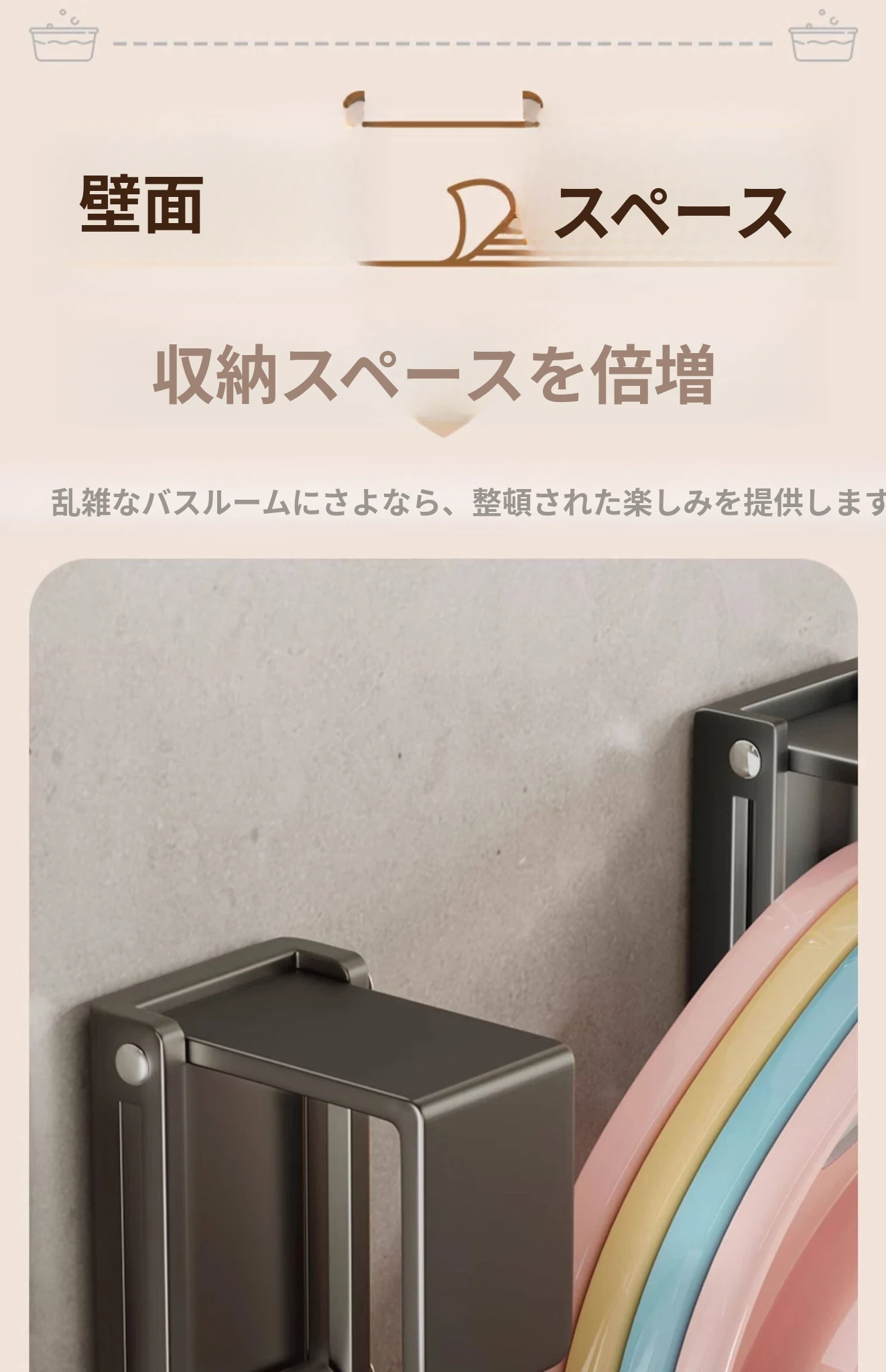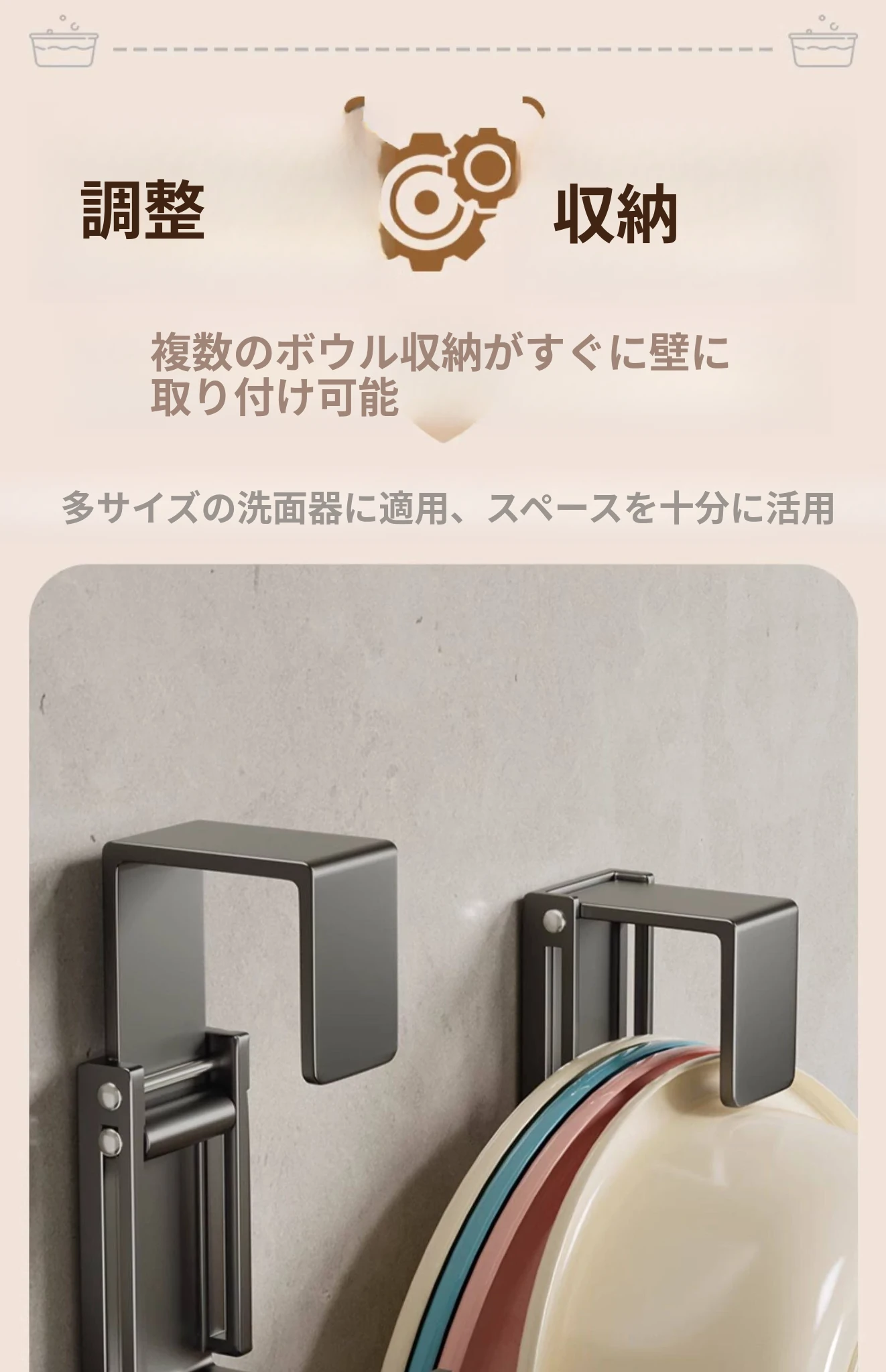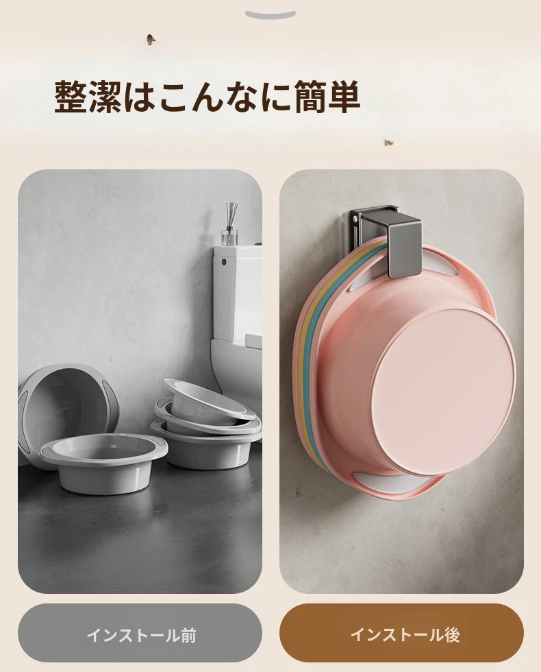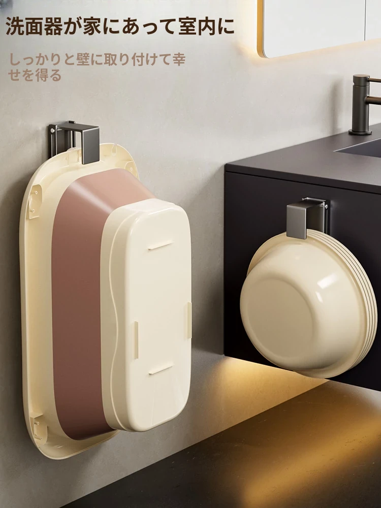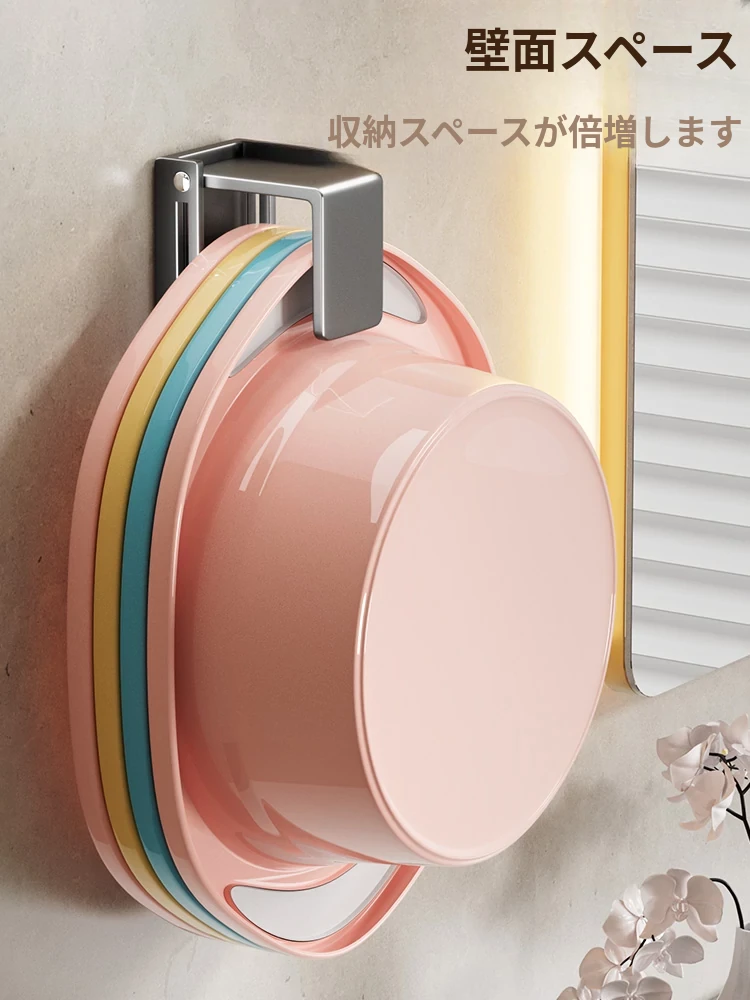 バスルームに最適!伸縮式洗面器収納ラック - 壁掛けタイプで穴あけ不要、洗面器やバスタブをスッキリ整理できる便利なフック付き!清潔感あふれるおしゃれな空間を実現します。