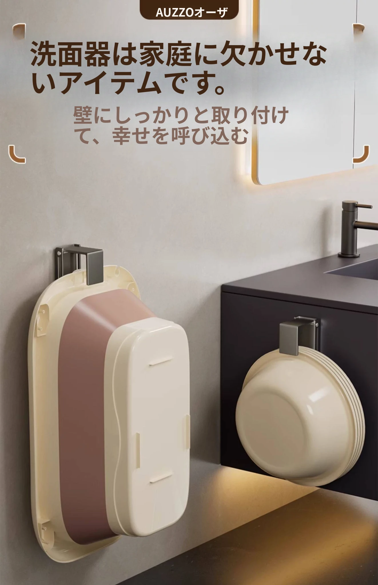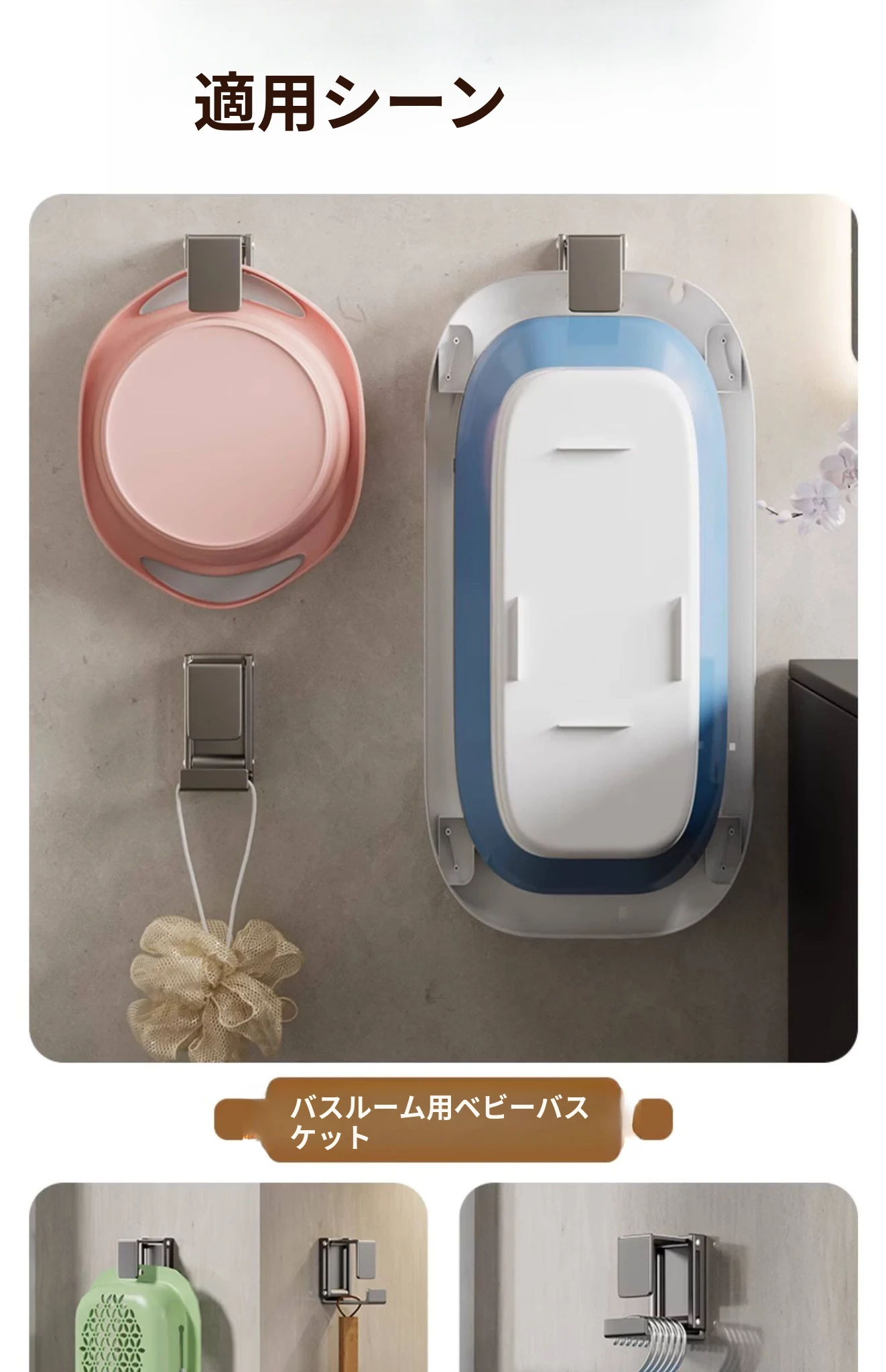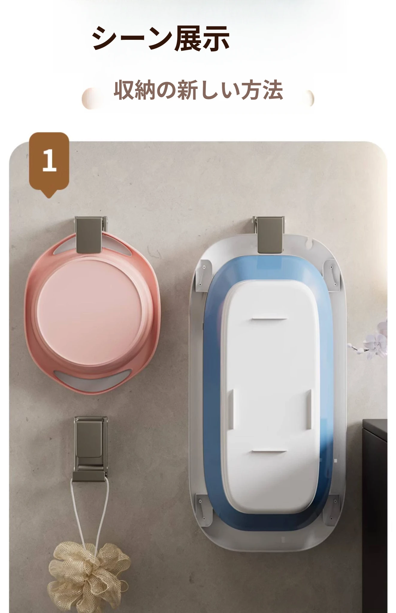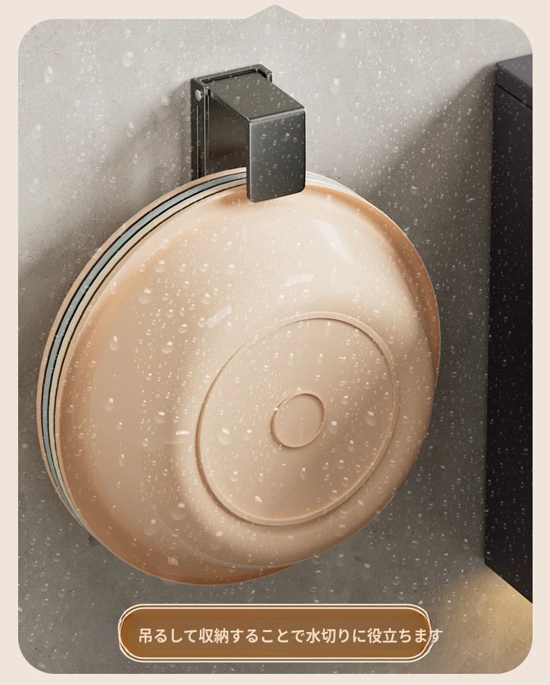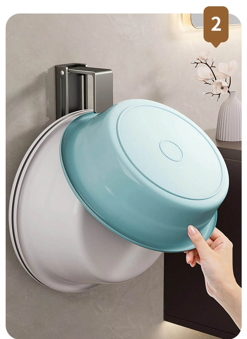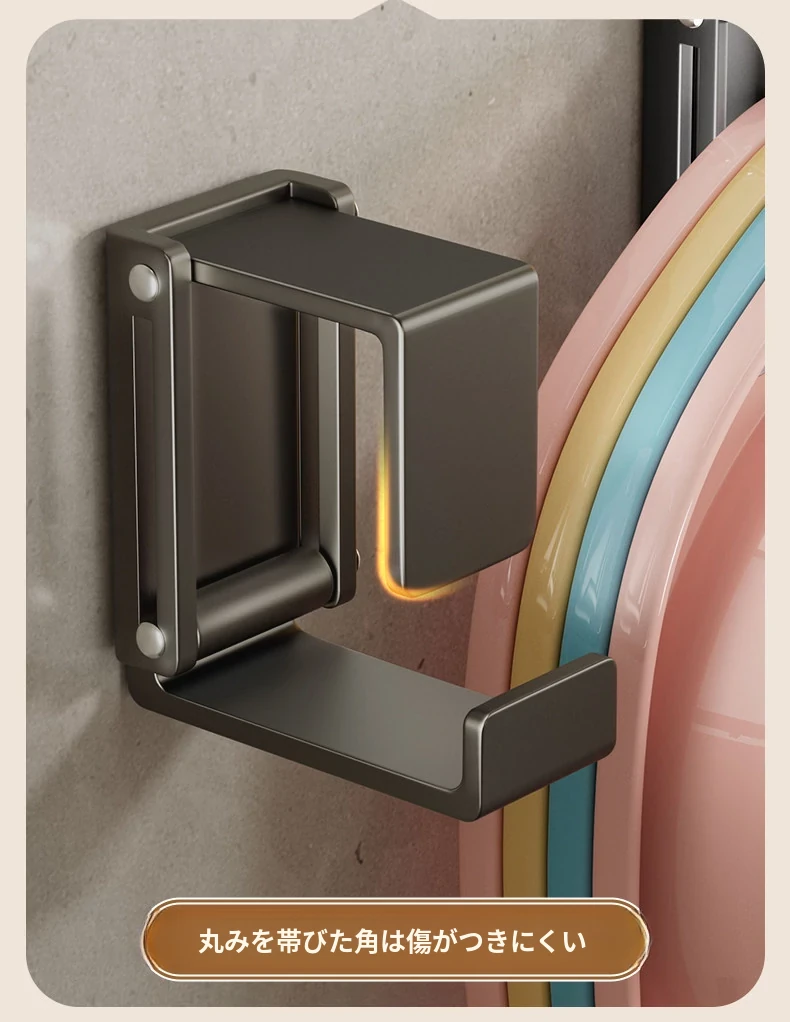 バスルームに最適!伸縮式洗面器収納ラック - 壁掛けタイプで穴あけ不要、洗面器やバスタブをスッキリ整理できる便利なフック付き!清潔感あふれるおしゃれな空間を実現します。