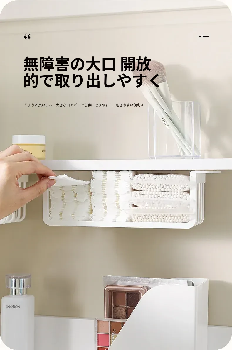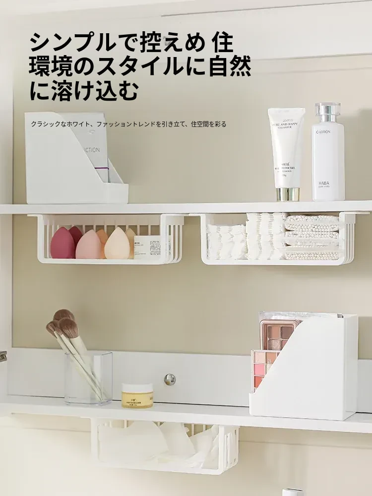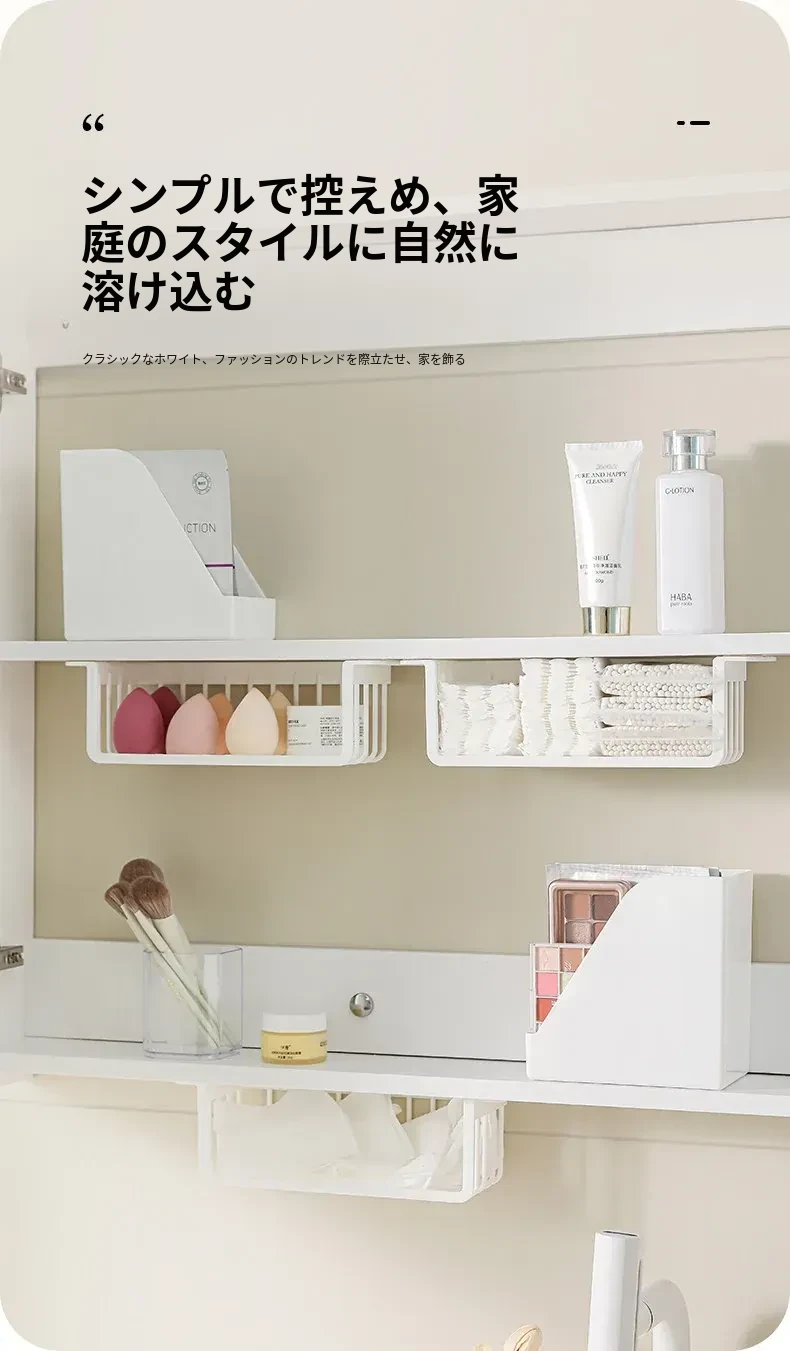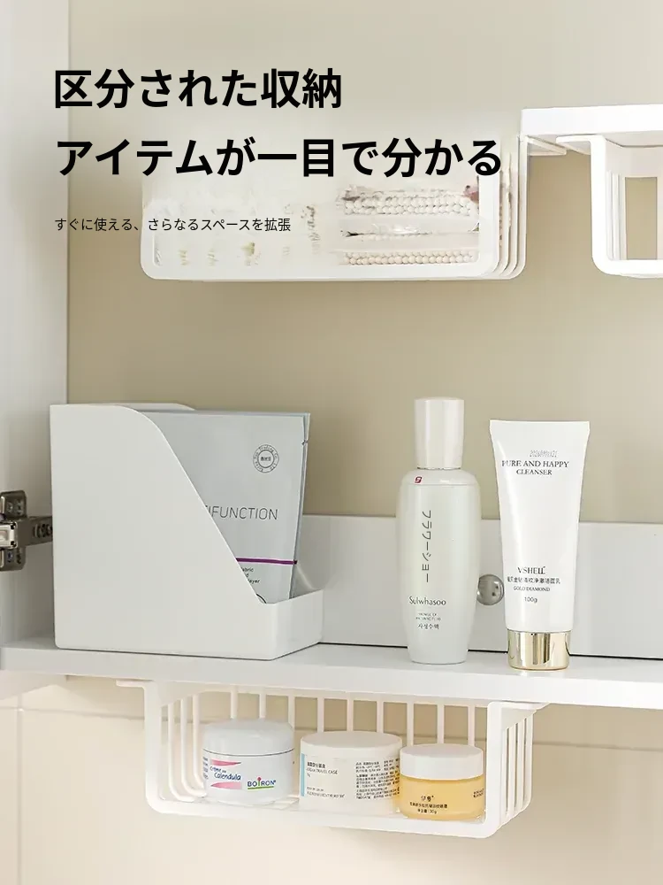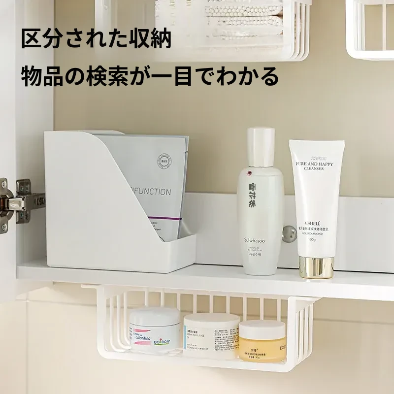 鏡台下収納ボックス|バスルーム用化粧品整理|クレンジングコットン・綿棒・フェイスマスク用|透明ディスプレイラック・ハンギングバスケットでスッキリ整理!