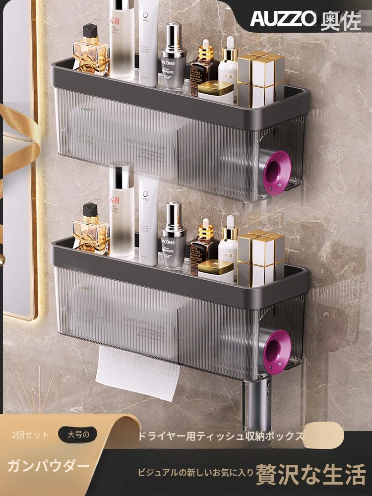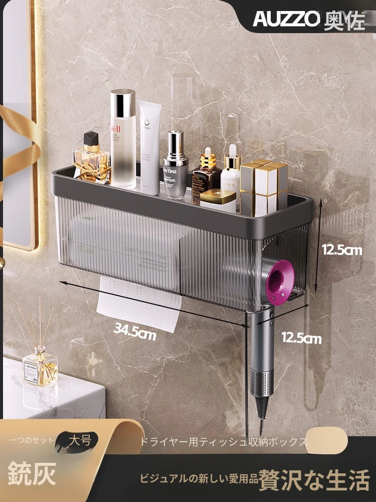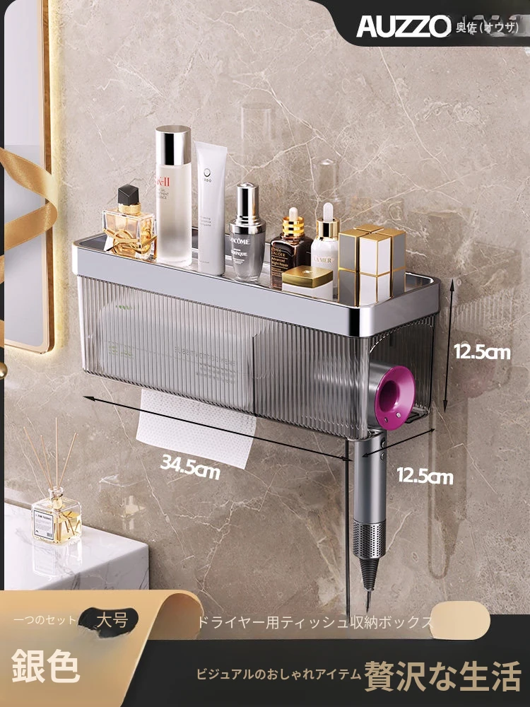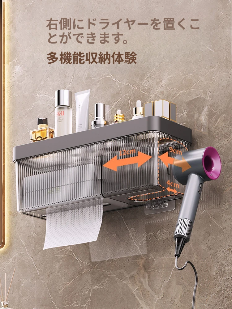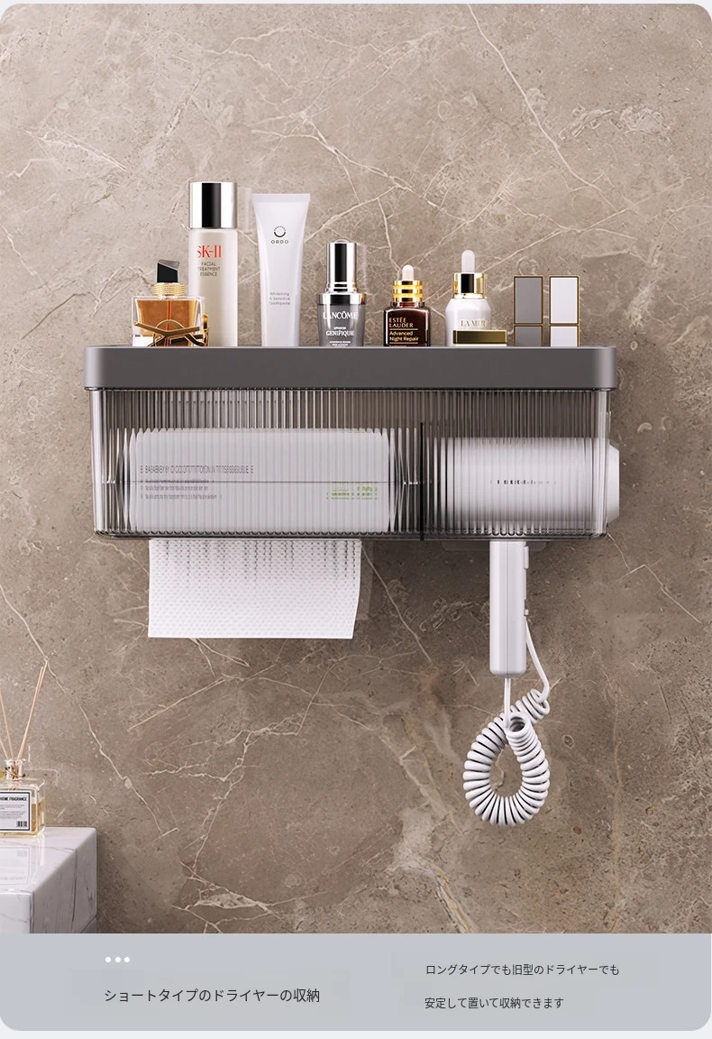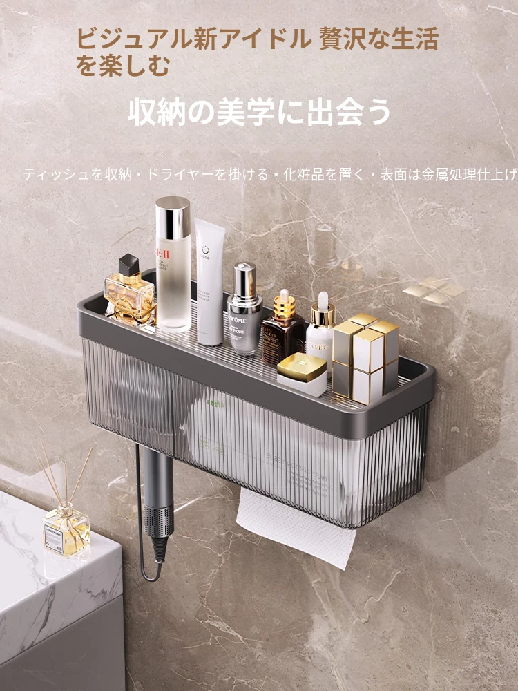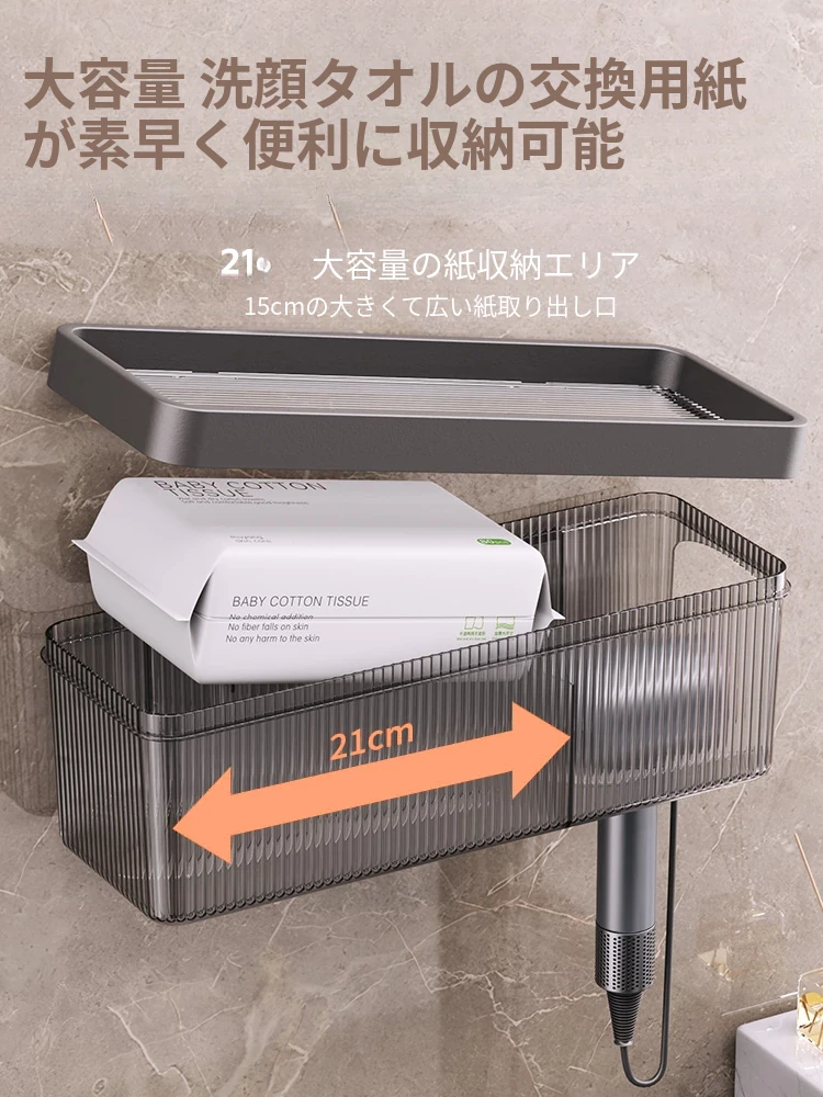 壁掛け式ヘアドライヤー収納ラック - 取り付け不要でおしゃれな洗面所を実現!タオルやティッシュも収納できる便利なアイテム。家庭用に最適なスッキリ整理整頓をサポートします。
