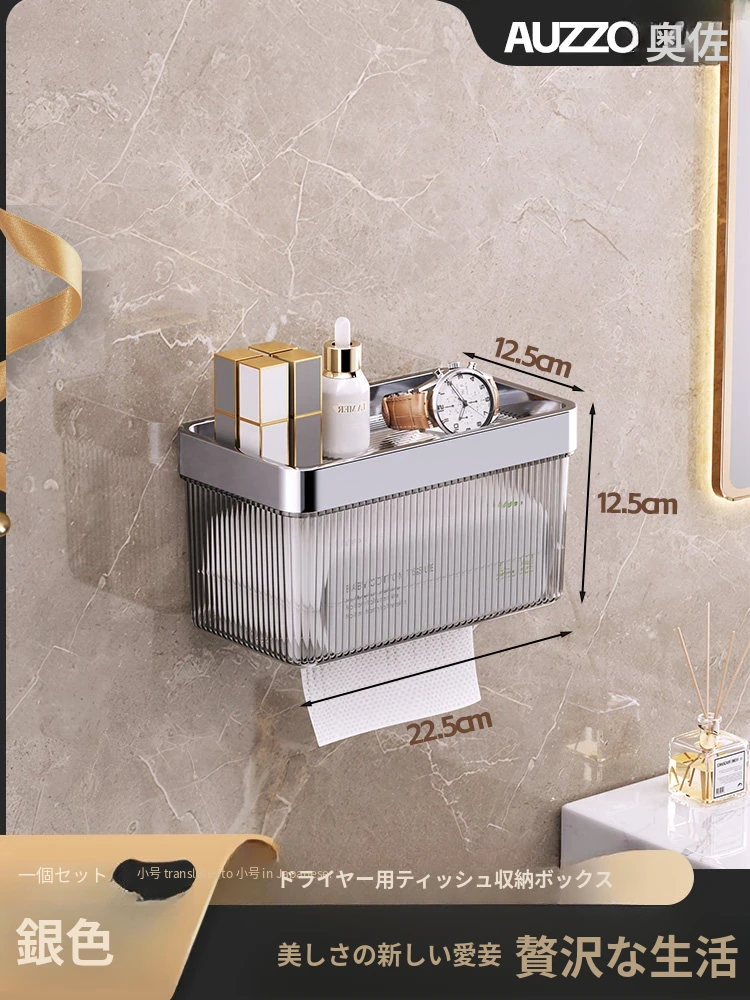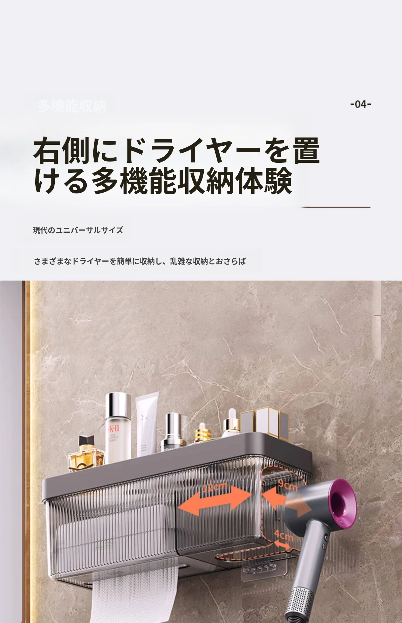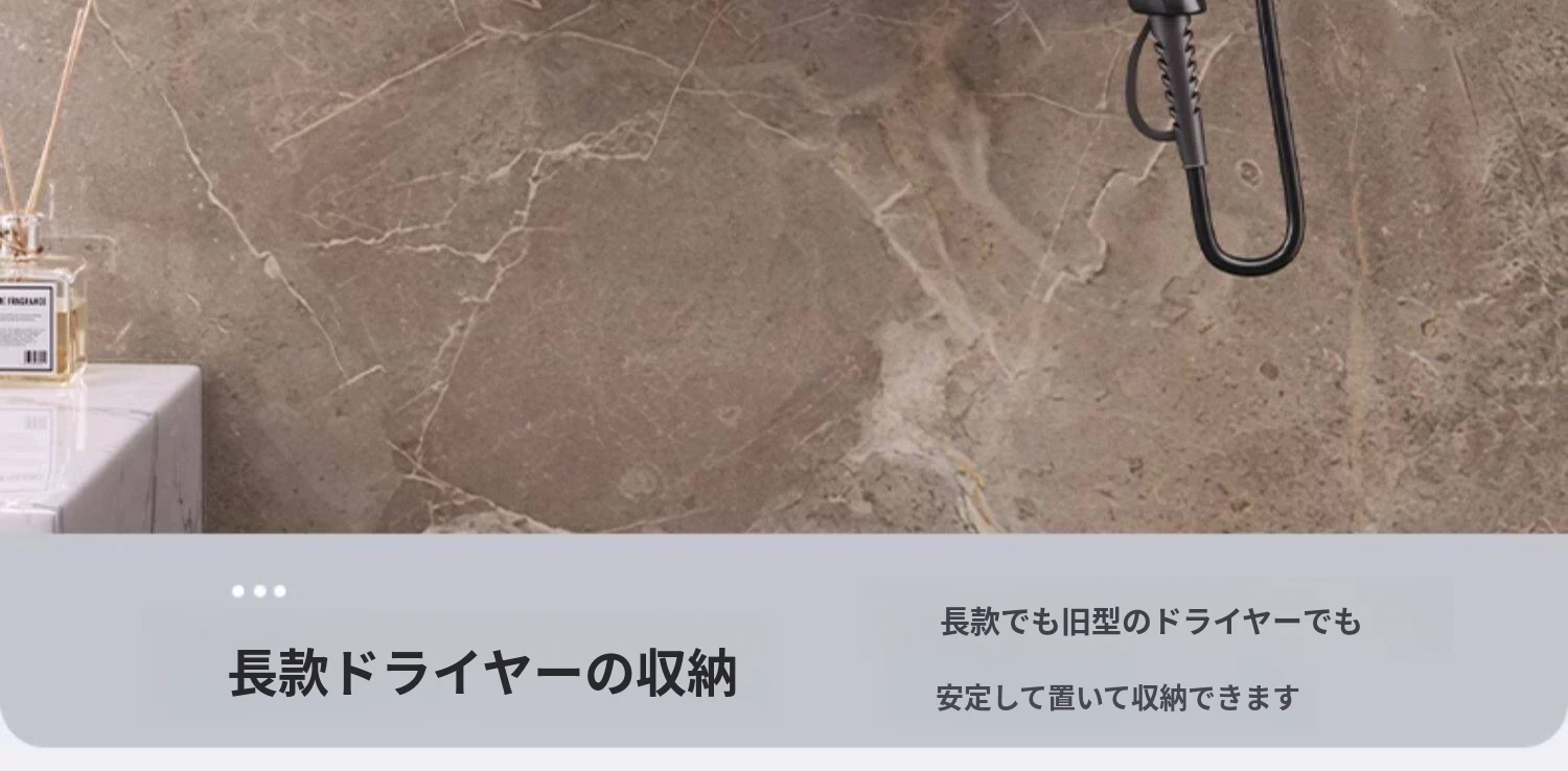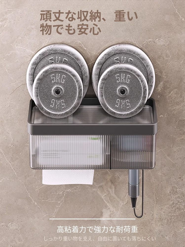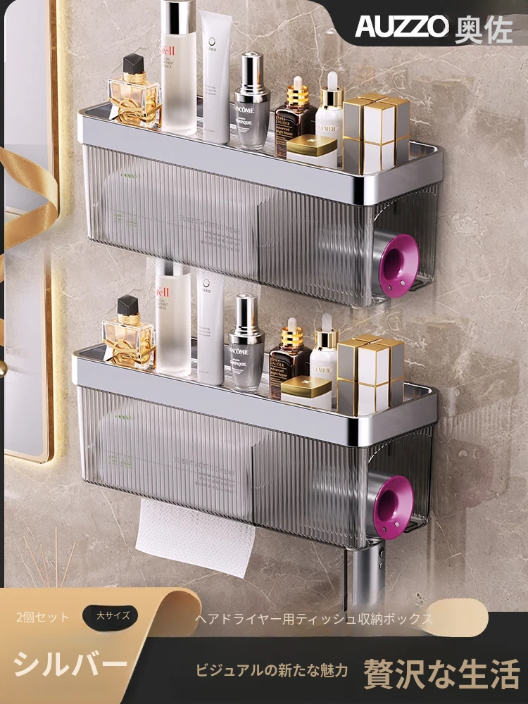 壁掛け式ヘアドライヤー収納ラック - 取り付け不要でおしゃれな洗面所を実現!タオルやティッシュも収納できる便利なアイテム。家庭用に最適なスッキリ整理整頓をサポートします。