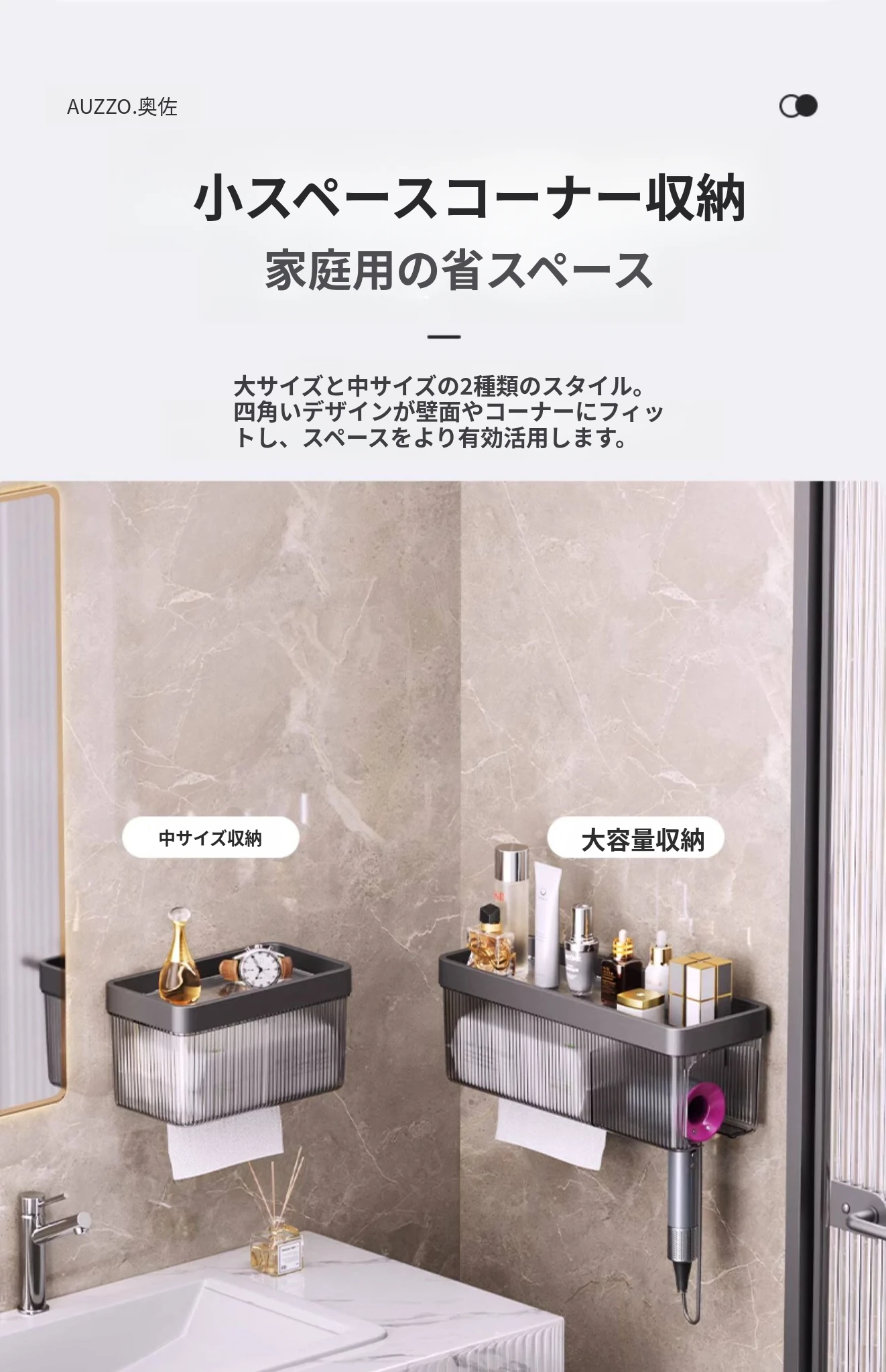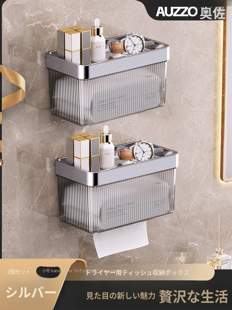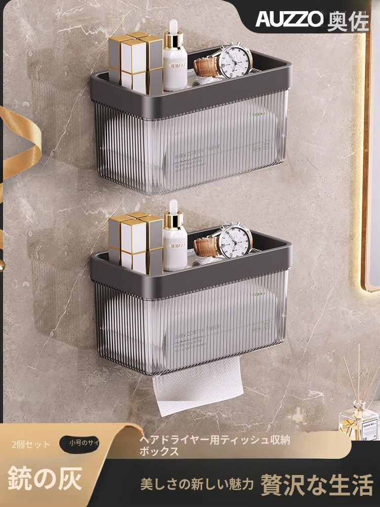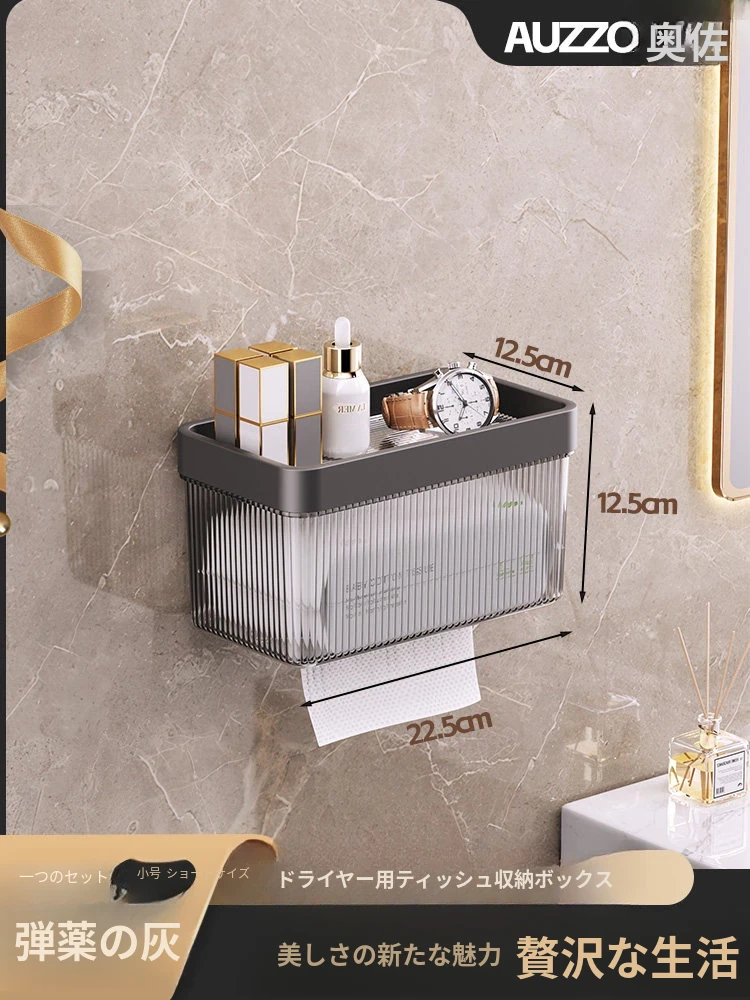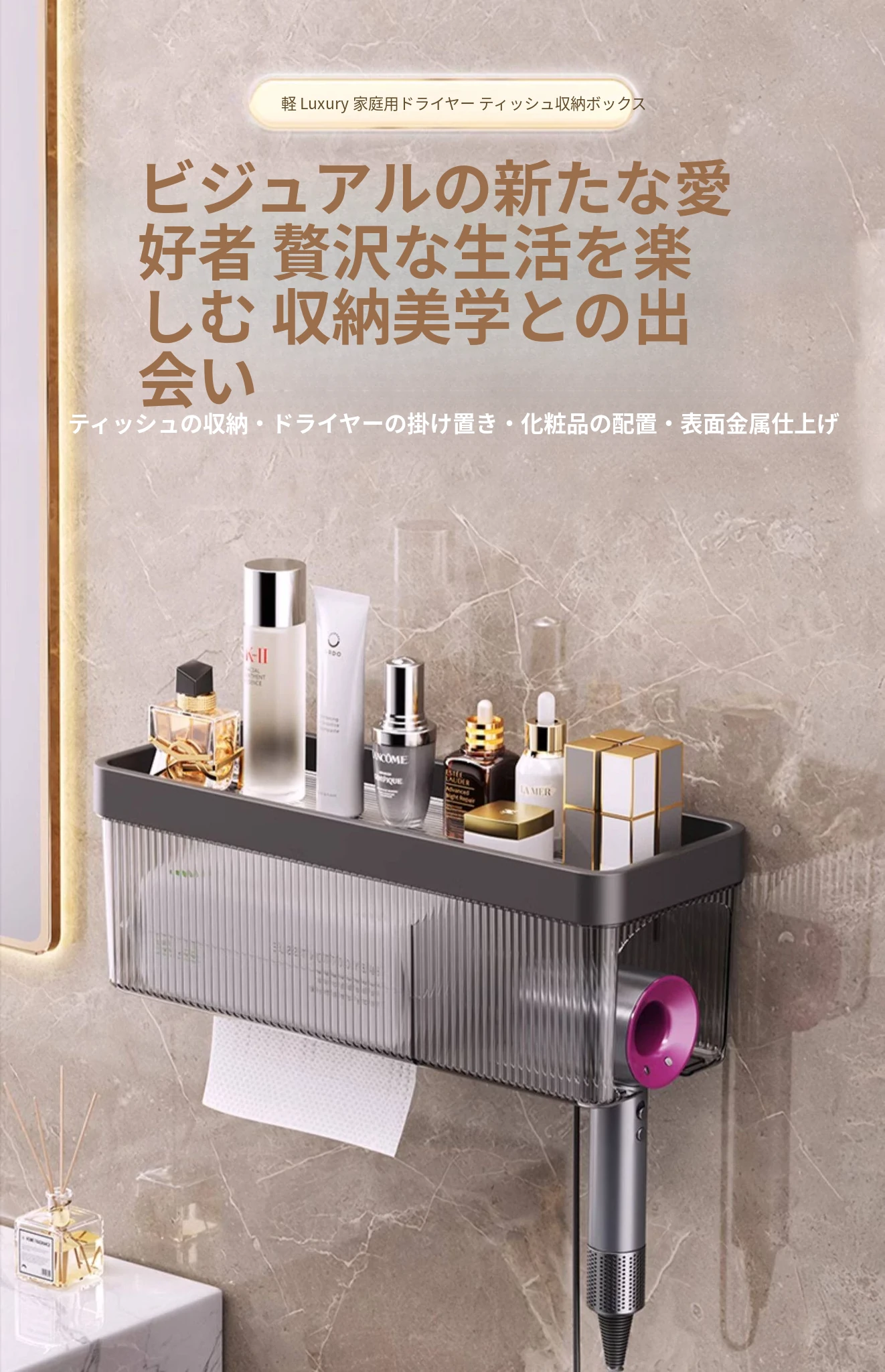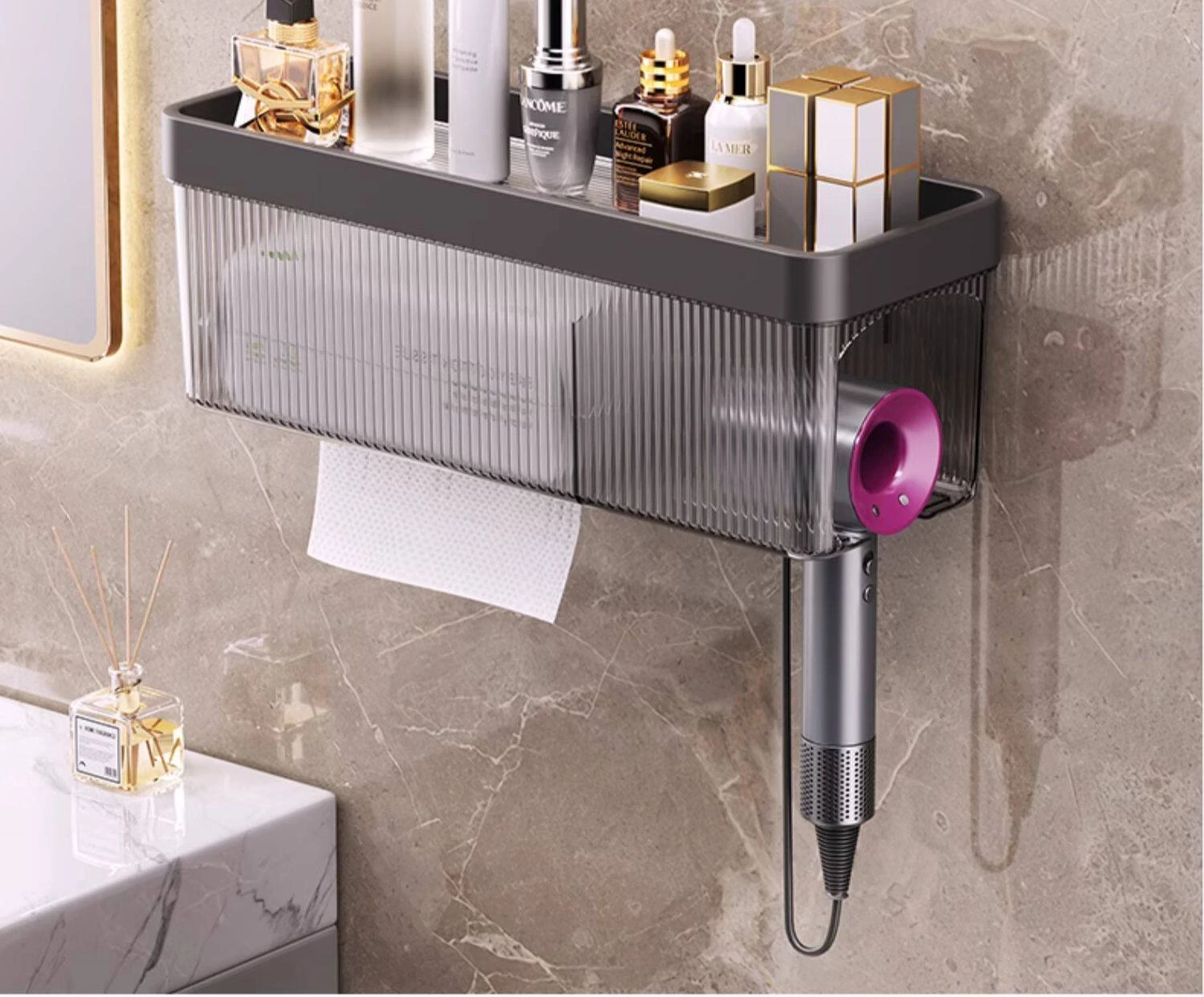 壁掛け式ヘアドライヤー収納ラック - 取り付け不要でおしゃれな洗面所を実現!タオルやティッシュも収納できる便利なアイテム。家庭用に最適なスッキリ整理整頓をサポートします。