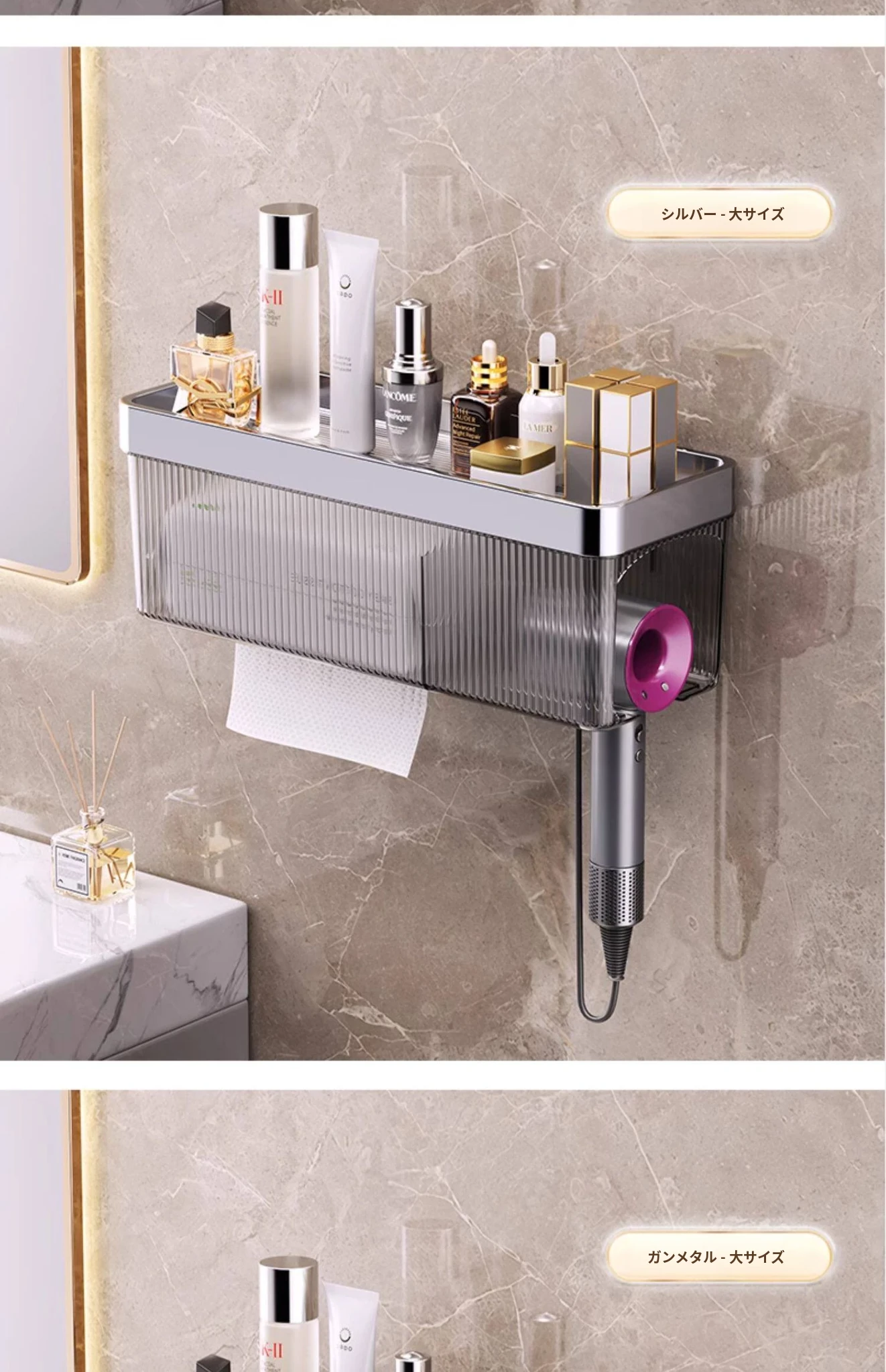 シルバー【ドライヤー/ティッシュ/フェイスタオルラック】