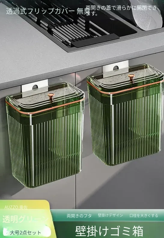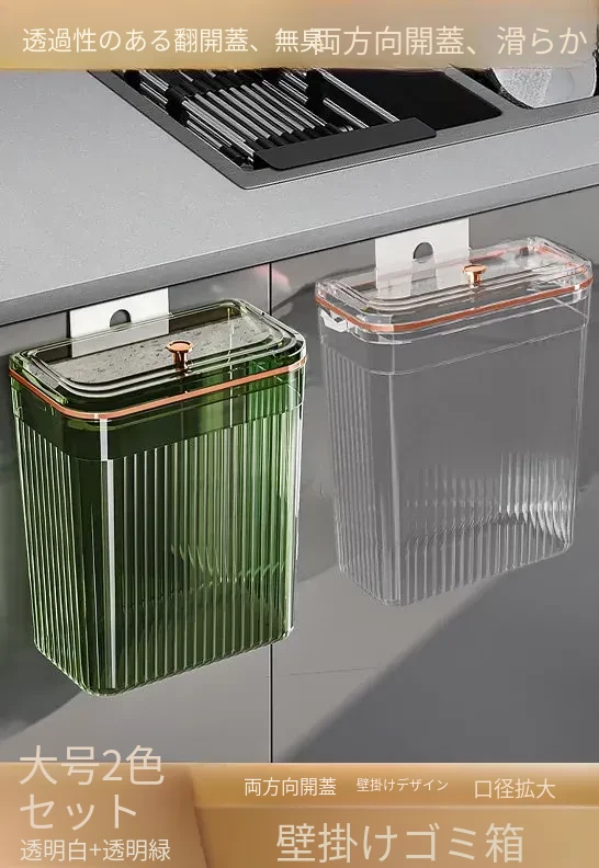 透明グリーン大号*2個セット【壁掛けスライド蓋ゴミ箱】