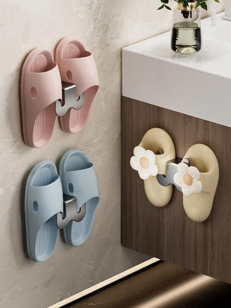 壁掛け式バスルームスリッパラック - ノーネイルで簡単取り付け!水切りデザインで清潔なトイレ空間を実現。スリッパや小物をスマートに収納できる便利なフック付き!