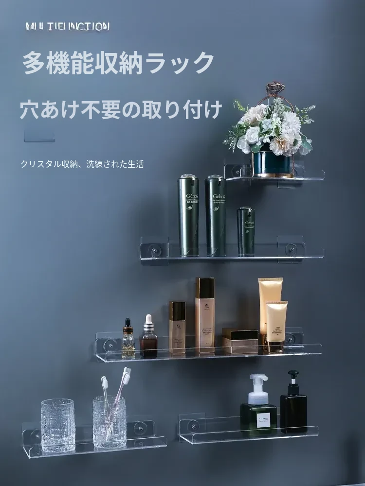 穴あけ不要!トイレにぴったりな透明壁掛け収納ラック - キッチンやバスルームで大活躍するおしゃれな一字型棚!整理整頓が簡単にできる便利アイテム!