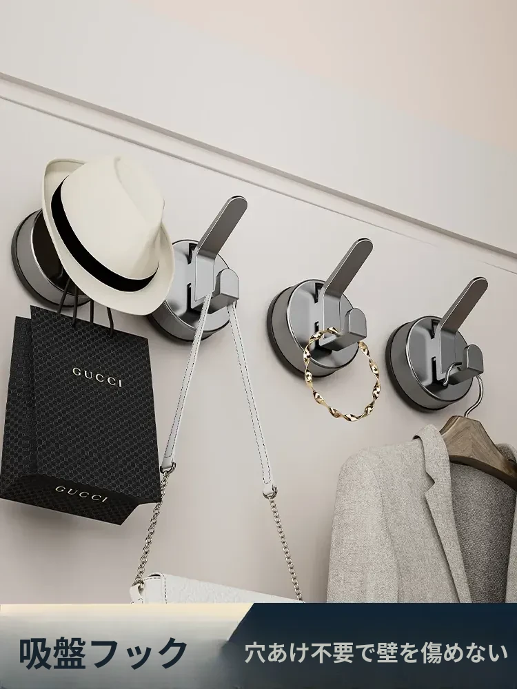 吸盤フック - 簡単取り付け、穴なし!強力粘着でバスルームや玄関に最適。おしゃれなデザインで、衣類や小物をしっかり支えます。真空吸引で強力固定、安心の無痕仕様!