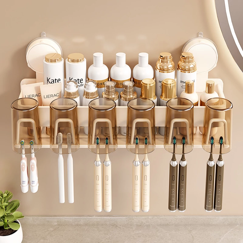 吸盤付き歯ブラシスタンド&マウスカップホルダー - 電動歯ブラシや歯具をスマートに収納!壁掛け式でスペースを有効活用し、衛生的なバスルームを実現!