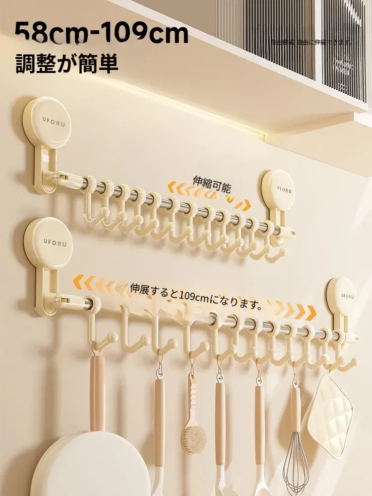 キッチン用鍋やお玉をスッキリ収納!便利な壁掛けラック&フックで、調理器具をスマートに整理。ナイフやスプーンも一列に収納できるから、キッチンがすっきり!粘着フック付きで簡単設置。