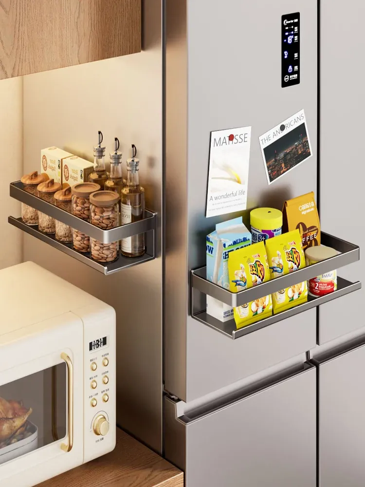 キッチン収納の必需品!冷蔵庫にぴったりなマグネット式多機能スパイスラック。保鮮袋も収納できる壁掛けタイプの便利グッズで、家事をもっと楽に!